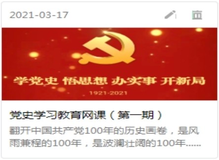 公司以手机移动端网页为载体,根据习近平《论中国共产党历史》以及共产党员网刊发的《党史故事100讲》《历次党代会》《中国精神》《百年瞬间》等资料和文献,按中共党史时间主线,整理编辑党史中重大历史事件、革命先辈和英烈的光辉事迹,以及历次党代会重要决议和重大影响为主要内容,开设“学党史、悟思想、办实事、开新局”党史学习专栏,创办党史学习教育网课,并在网课尾页增设党史知识测试,检验学习成果,加深学习记忆。