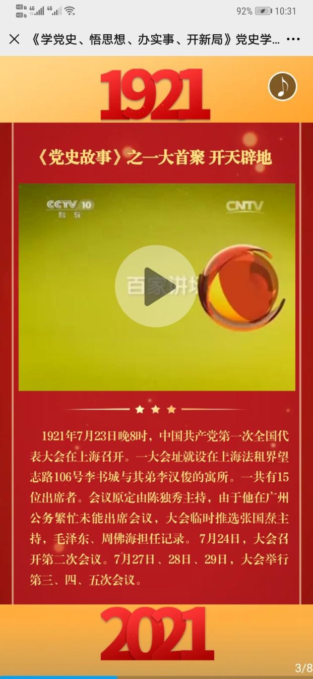 期间,公司以手机移动端网页为载体,根据习近平《论中国共产党历史》以及共产党员网刊发的《党史故事100讲》《历次党代会》《中国精神》等资料和文献,开设“学党史、悟思想、办实事、开新局”党史学习专栏,创办党史学习教育网课,目前已推送7期,累计学习已达700余人次。