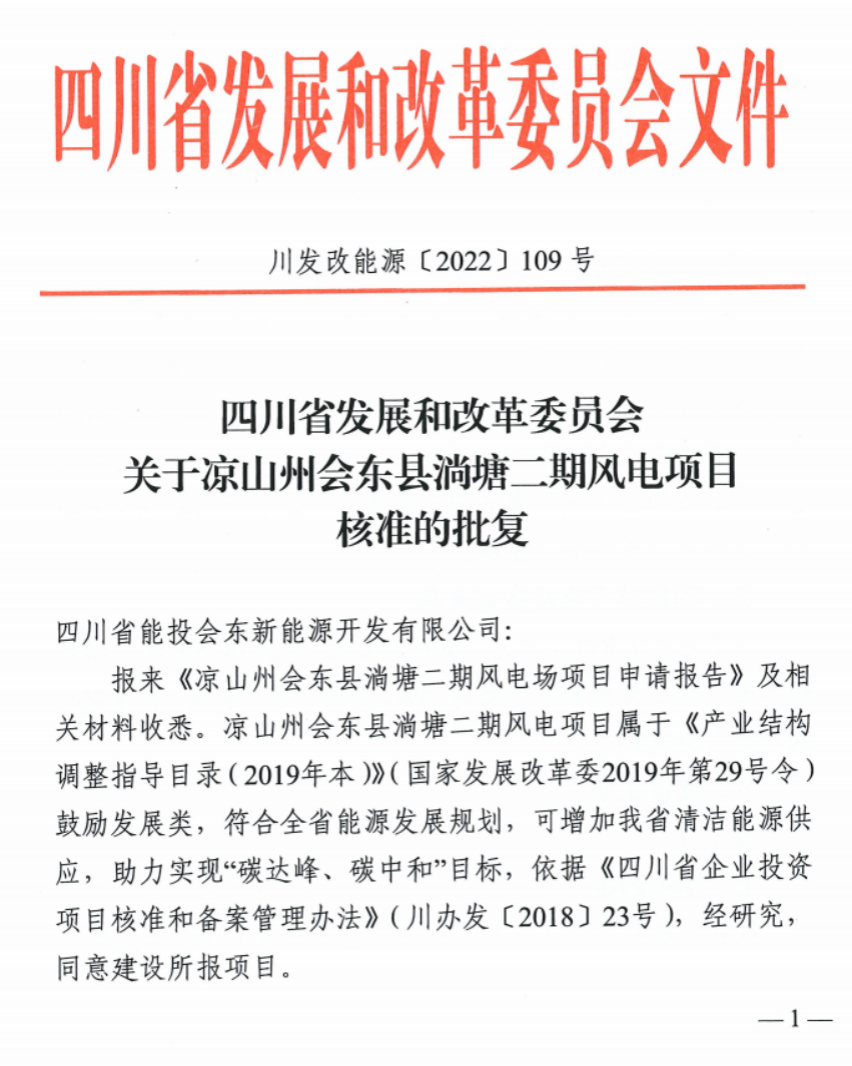 近期,四川能投风电公司所属会东新能源公司淌塘二期风电场项目取得四川省发改委核准批复文件,这是该公司“十四五”新核准的第二个风电项目。