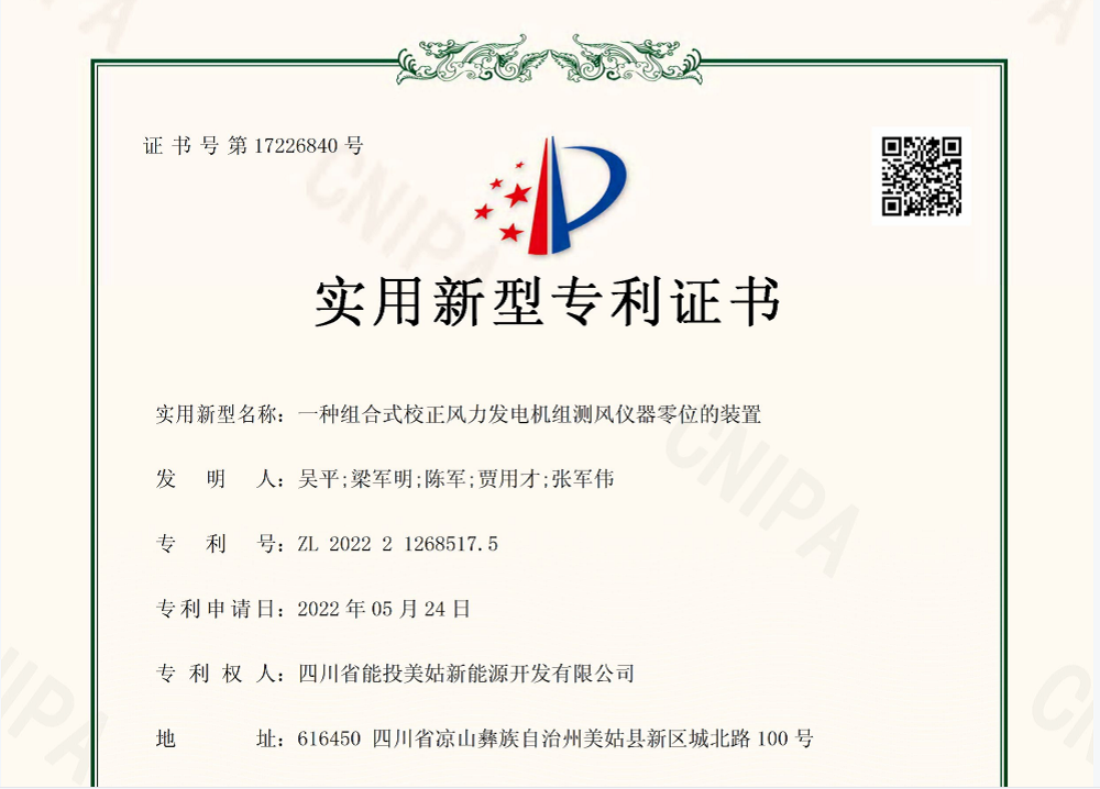 继8月取得“一种免爬器安全监测启动闭锁装置”实用新型专利后,美姑公司在9月再获两项实用新型专利。专利成果是美姑公司全体干部职工在生产运维管理方面进行不断探索和实践取得的,专利名称分别为“风力发电机组直流变桨电机手动变桨装置”和“一种组合式校正风力发电机组测风仪器零位的装置”。