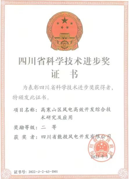 由公司牵头开展的《高寒山区风电高效开发综合技术研究及应用》科研项目荣获2022年度四川省科学技术进步二等奖,实现公司成立以来省部级科学技术奖零的突破。针对高山风电场夏季雷暴频发的特点所开展的风电机组主动式避雷系统研究,成功实现雷电的主动泄放,有效减少风电场叶片受雷击次数;而考虑山地风场湍流明显、风况多变特征而开展的激光测风雷达研究,则实现机舱前端100米风速、风频、风向测量,达到通过强化机组控制前缘反馈而增强机组发电能力的目的。