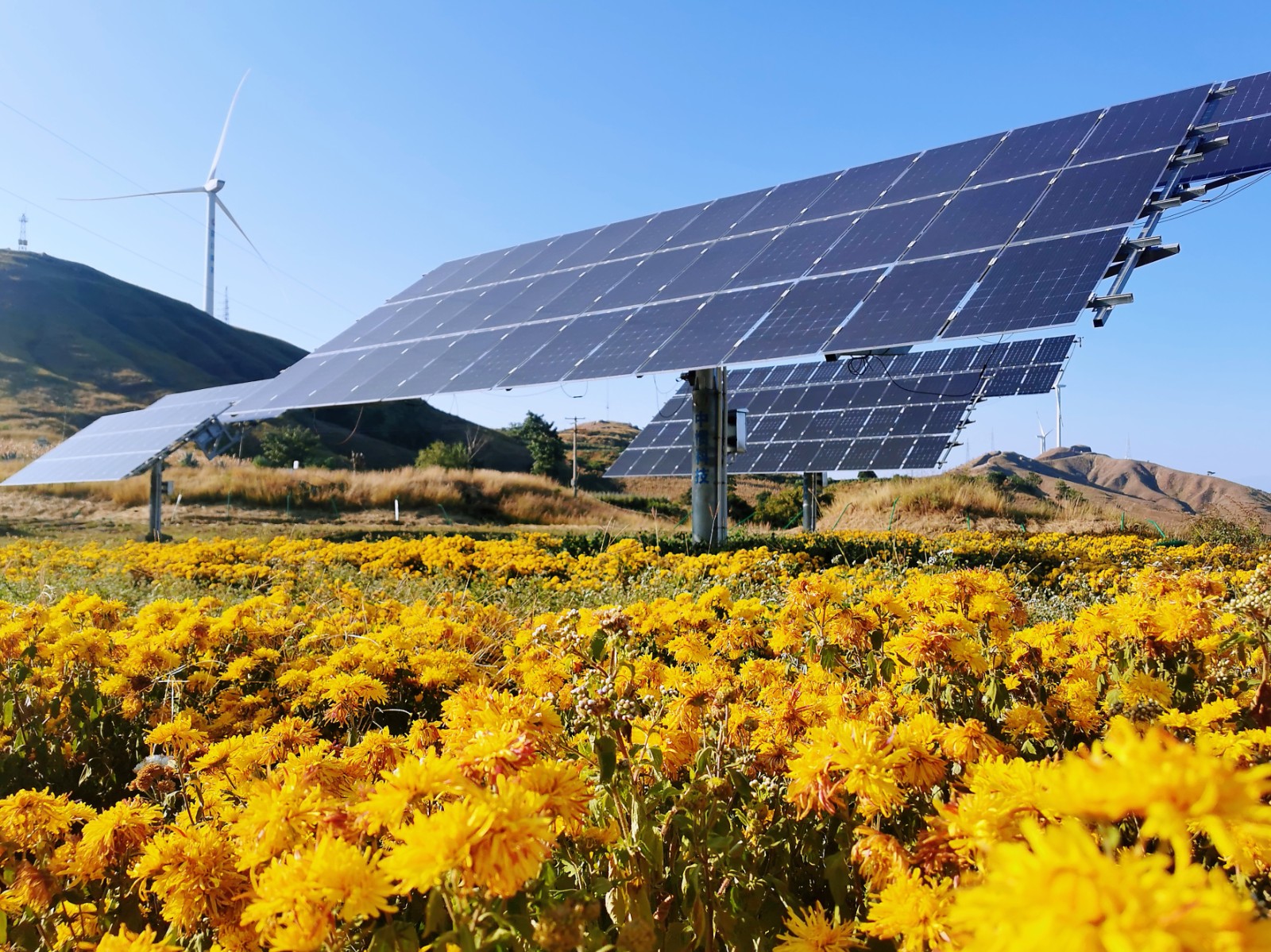 又是一年丰收季,攀枝花市盐边县大面山的光伏板下,金灿灿的菊花早已悄然绽放、傲立风中,形成了一片金色花海,远处山上的风机也在欢快的转动。这种花学名金丝皇菊,具有疏风散热、清热解毒的功效。10月到11月期间,四川能投风电盐边公司的同事们经常会聚集于此,经过采摘、烘干、整理、装盒几道工序,体验劳动的快乐和丰收的喜悦。