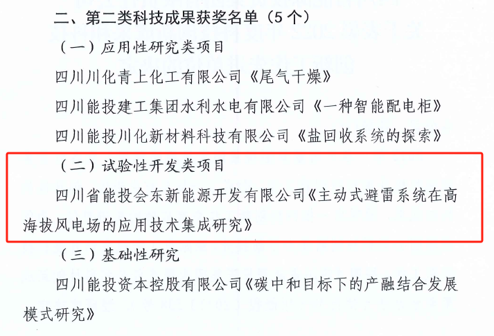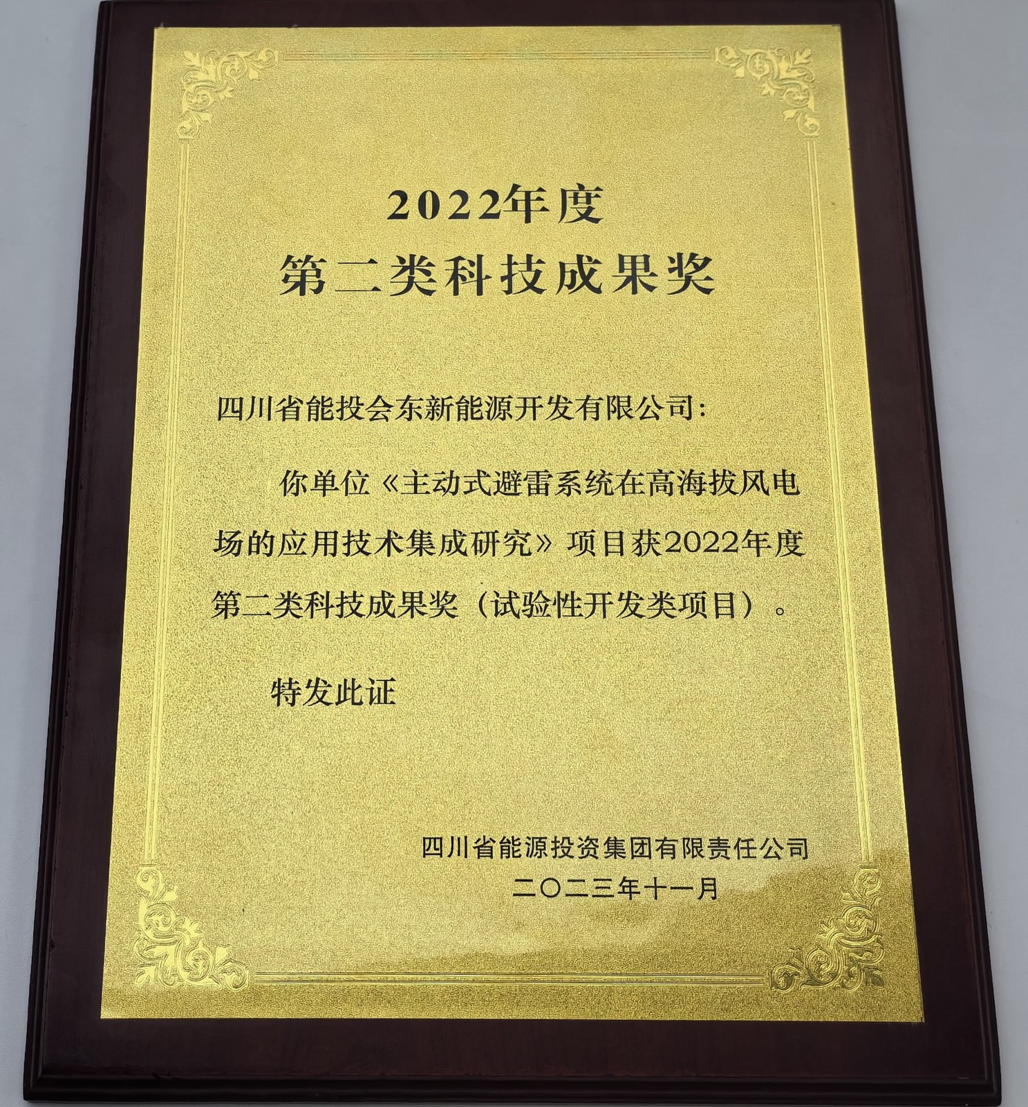 2023年12月6日,四川省能投科协成立大会暨四川能投2023年科技创新大会在成都召开,四川能投风电会东公司《主动式避雷系统在高海拔风电场的应用技术集成研究》科研项目荣获集团公司2022年度第二类科技成果奖。