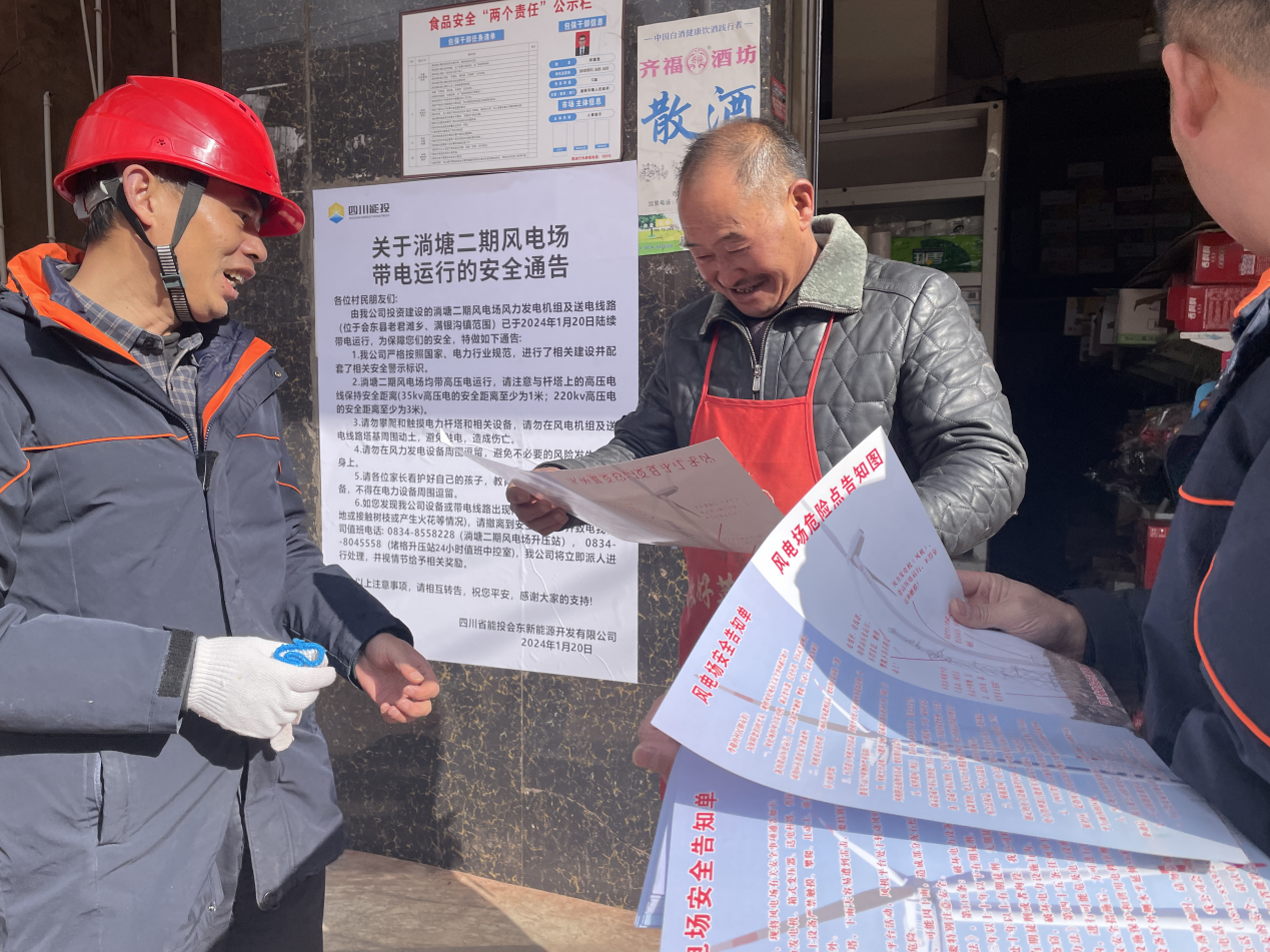 为保障淌塘二期风电场投运后设备设施的安全稳定运行,1月21日,四川能投风电会东公司组织人员到满银沟镇、老君滩乡开展以“防范触电”为主题的走乡村安全宣传专项活动。