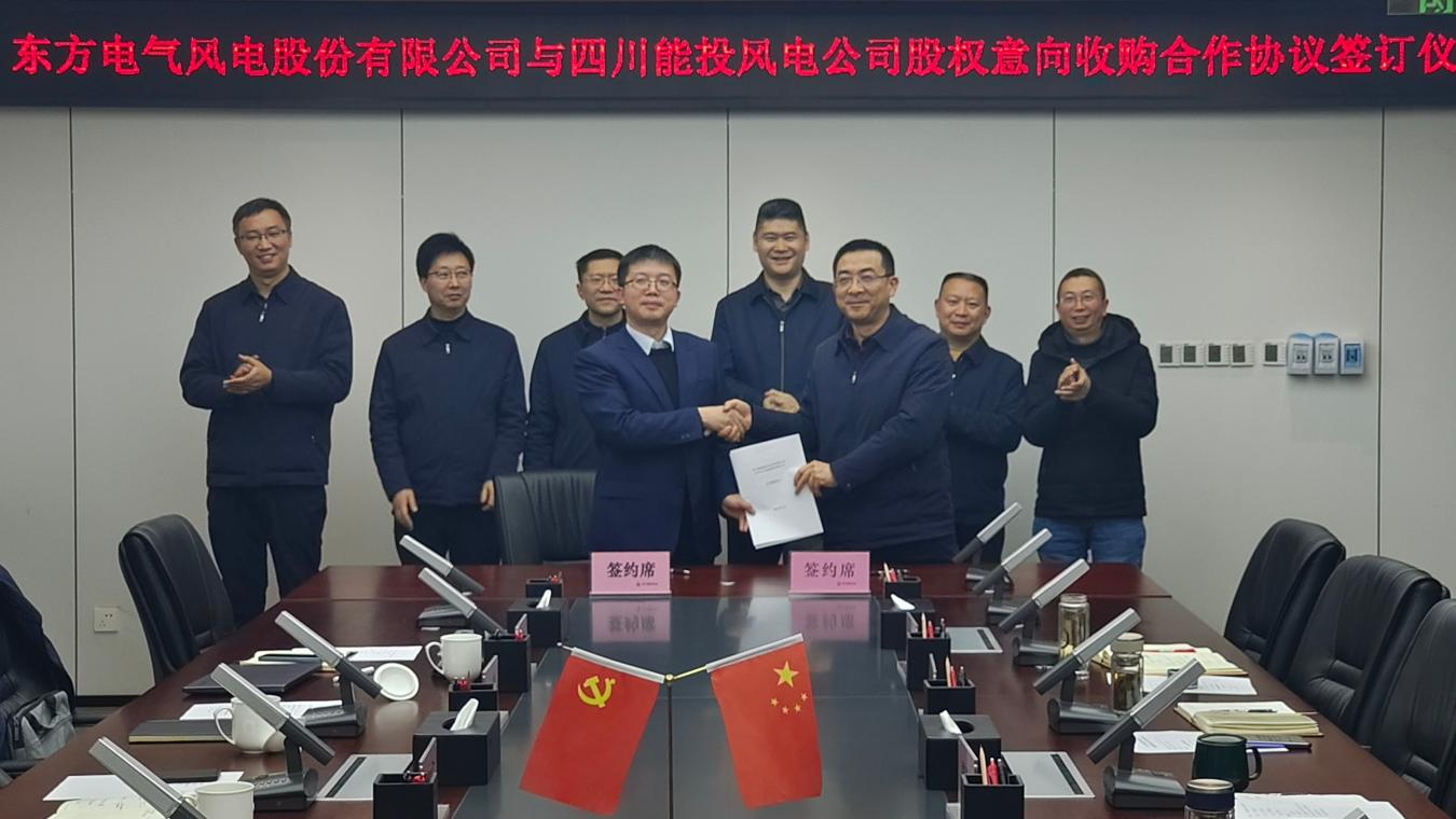 2月6日,东方风电公司党委书记、董事长尹守军一行到访四川能投风电公司,与四川能投风电公司党委书记、董事长吴平进行工作座谈并签订合作框架协议及股权意向收购合作协议,标志着双方合作关系的深化与进入新阶段。东方风电公司党委委员、副总经理马荣华,总经理助理、产发中心主任文利,四川能投风电公司副总经理王勇,副总经理胡开文见证此次签约。东方风电公司产发中心书记、西南公司总经理秦晴,四川能投风电公司计划发展部部长、盐边公司执行董事唐红强代表双方签订协议。