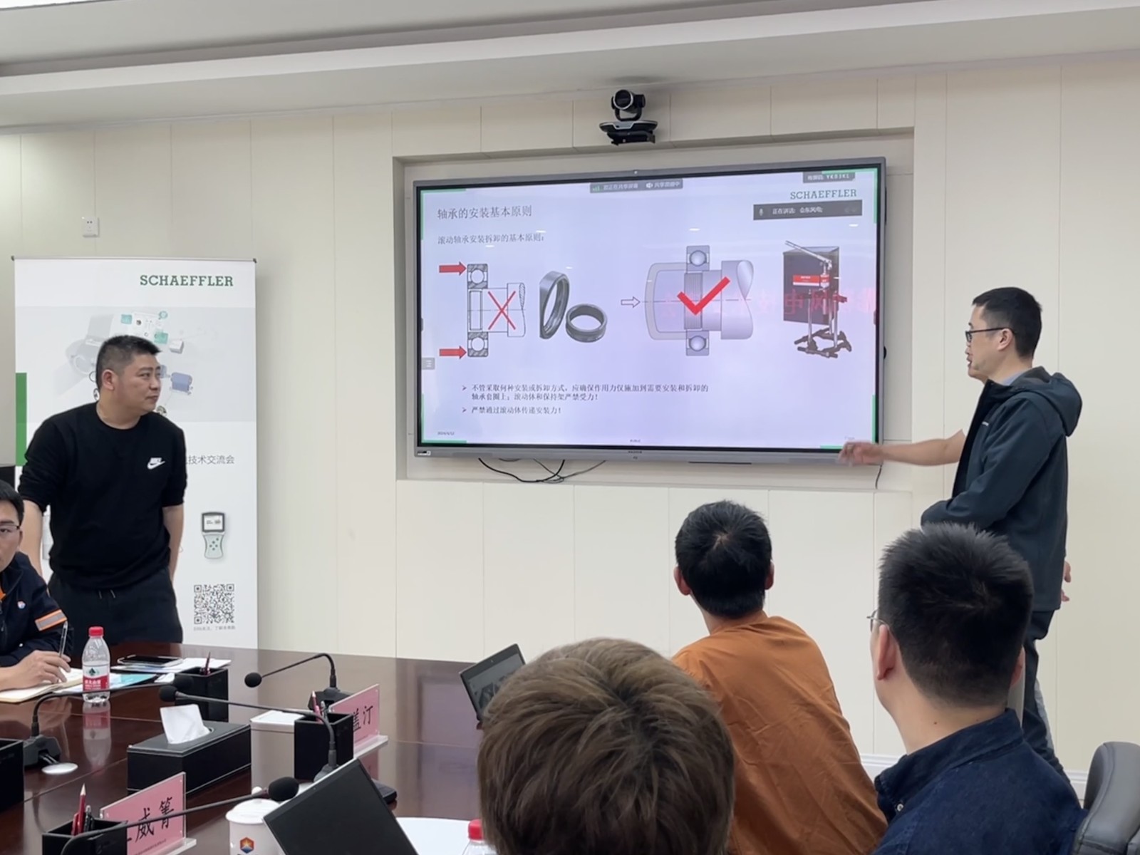会上,舍弗勒集团技术工程师分别就风电主轴承、齿轮箱轴承、发电机轴承常见问题及解决方案做了详细介绍,就轴承清洗及油脂更换,智能润滑系统的运用和振动分析等做了现场教学,分享了其他风电场轴承运行检测和更换的案例。运管部技术人员针对近期鲁北16号和拉马9号风机的主轴轴承损坏问题与舍弗勒集团技术工程师进行了深入交流,并围绕风机轴承现场运维管理、常见故障检修等进行了探讨。