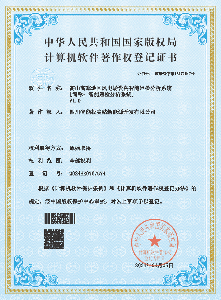 近日,四川能投风电美姑(雷波)公司自主研发的“高山高寒地区风电场设备智能巡检分析系统”经中国版权保护中心审核登记,成功取得中华人民共和国国家版权局计算机软件著作权登记证书。这一成就标志着我们在风电行业信息化、智能化运维领域的探索迈出了坚实的一步,也彰显了美姑(雷波)公司在科技创新研发上的实力和决心。