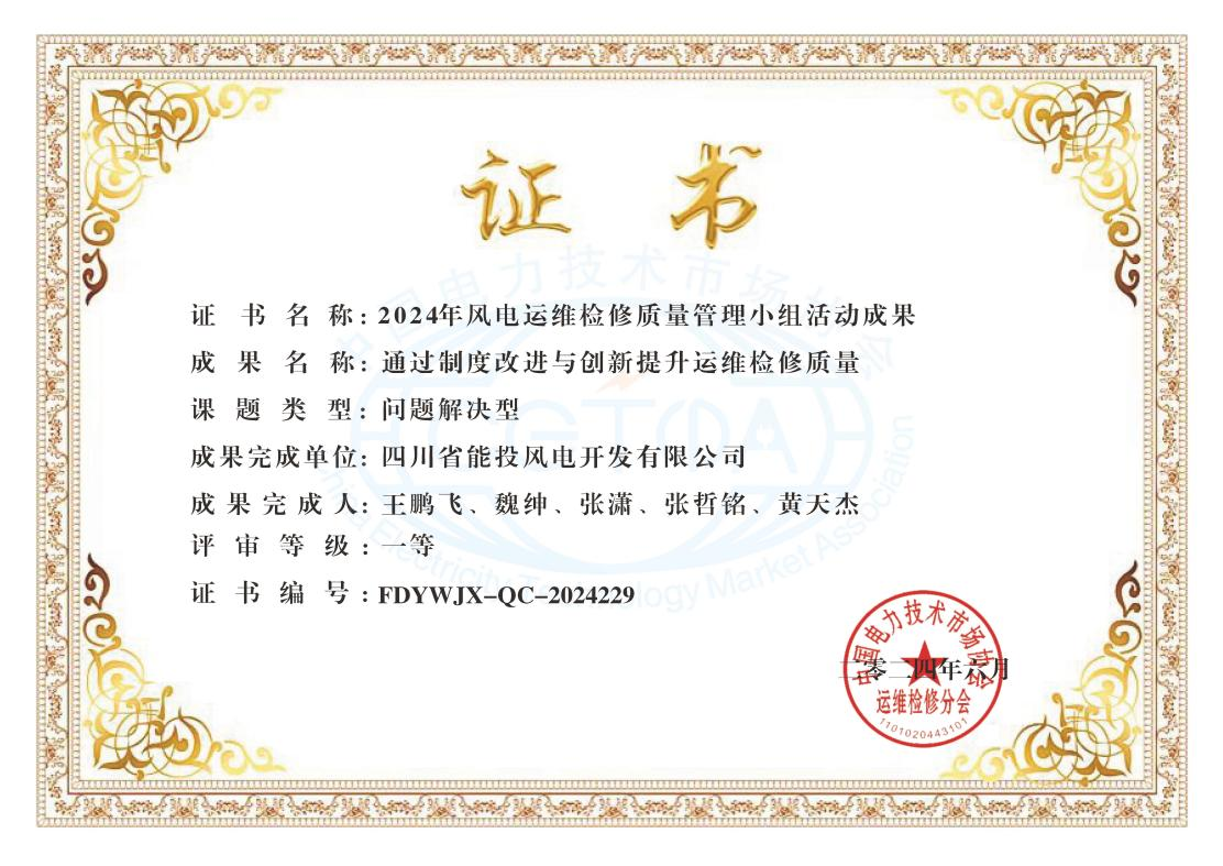 近日,在湖南长沙由中国电力技术市场协会运维检修分会举办的2024年风电智慧运维检修技术年会暨2024年风电运维检修质量管理小组活动成果现场发表交流会上,经专家评审并公示,四川能投风电公司集控中心运维检修质量管理小组的《通过制度改进与创新提升运维检修质量》课题荣获一等奖。