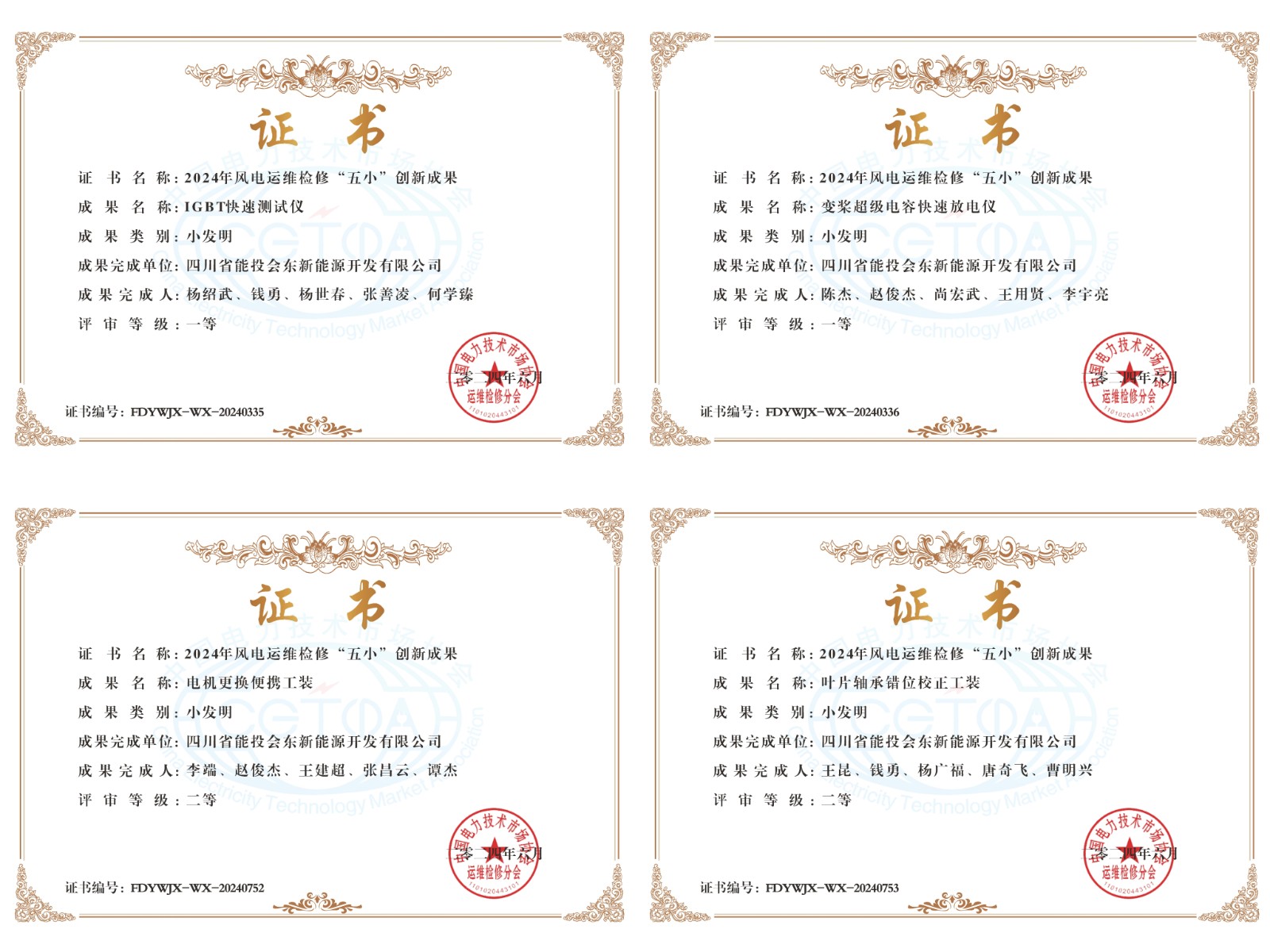 智慧火花点亮荣耀之路,中国电力技术市场协会运维检修分会于近日揭晓了2024年风电运维检修“五小”创新成果榜单,四川能投风电会东公司以匠心独运的创新成果,在评选现场大放异彩。其中,《IGBT快速测试仪》《变桨超级电容快速放电仪》摘取一等奖,《电机更换便携工装》《叶片轴承错位校正工装》荣获二等奖。