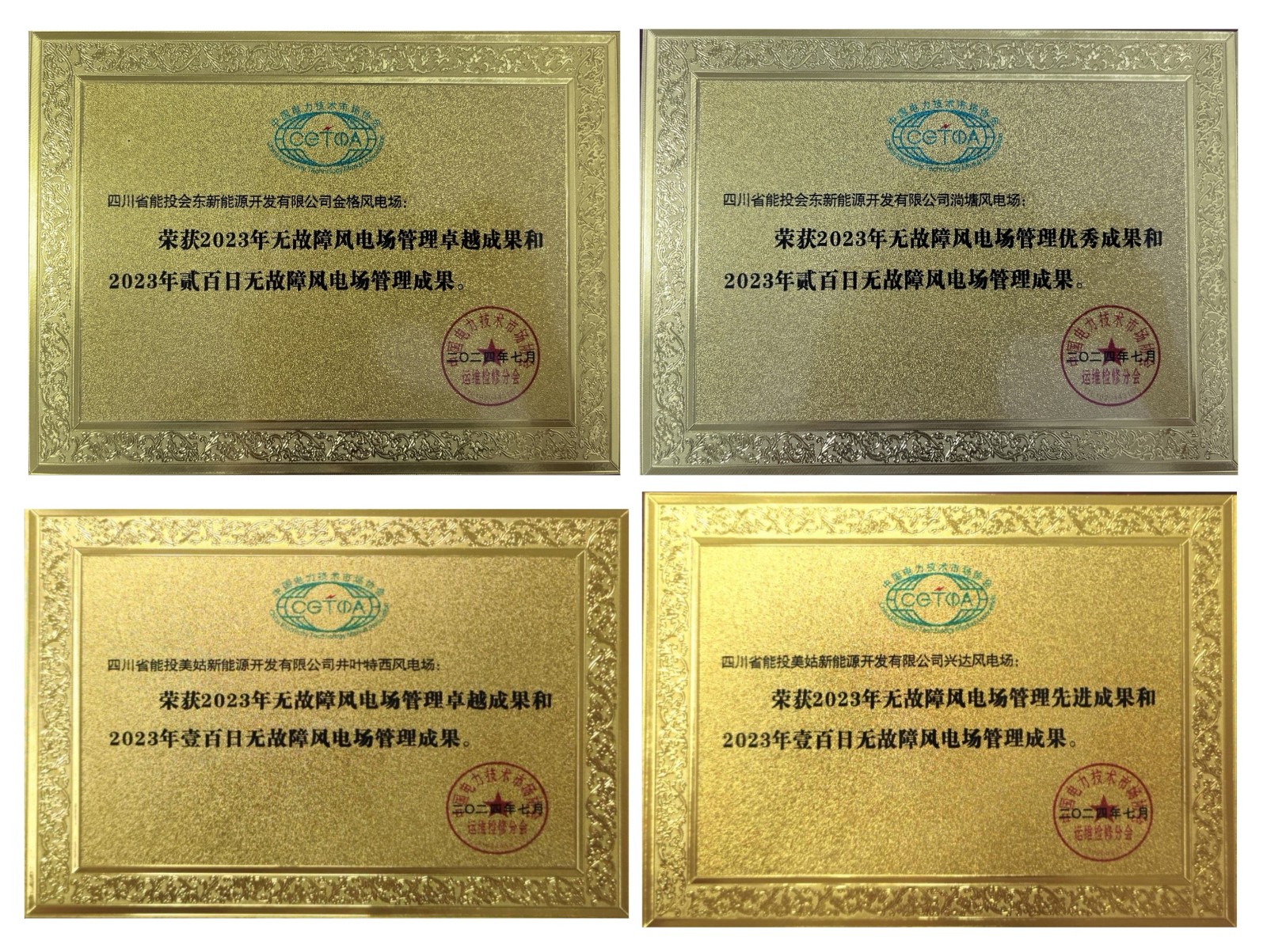 近日,由中国电力技术市场协会组织的第四届全国无故障风电场建设年会暨2023年无故障风电场管理成果发布会在河南郑州隆重召开。四川能投风电公司所属金格、淌塘、井叶特西及兴达风电场分别以224天、207天、170天及164天的无故障运行天数记录荣获全国“2023年无故障风电场管理成果奖”,其中金格和淌塘风电场更是获评“贰佰日无故障风电场”,树立了全国无故障风电场管理标杆。