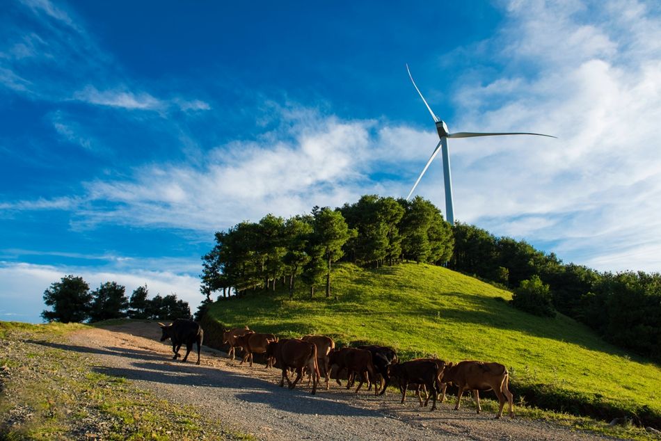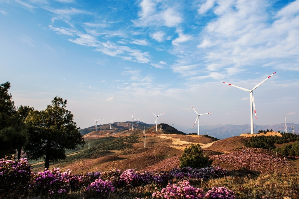在苍松矗立翠柏层叠中,在奇峰罗列怪石嶙峋中,在绿草叠翠山花烂漫中,风车欢快飞旋,牛羊牧马逍遥自在,风电建设者用其巧夺天工之手为大自然的鬼斧神工再添绝美一笔,构成一幅和谐美丽的画卷。