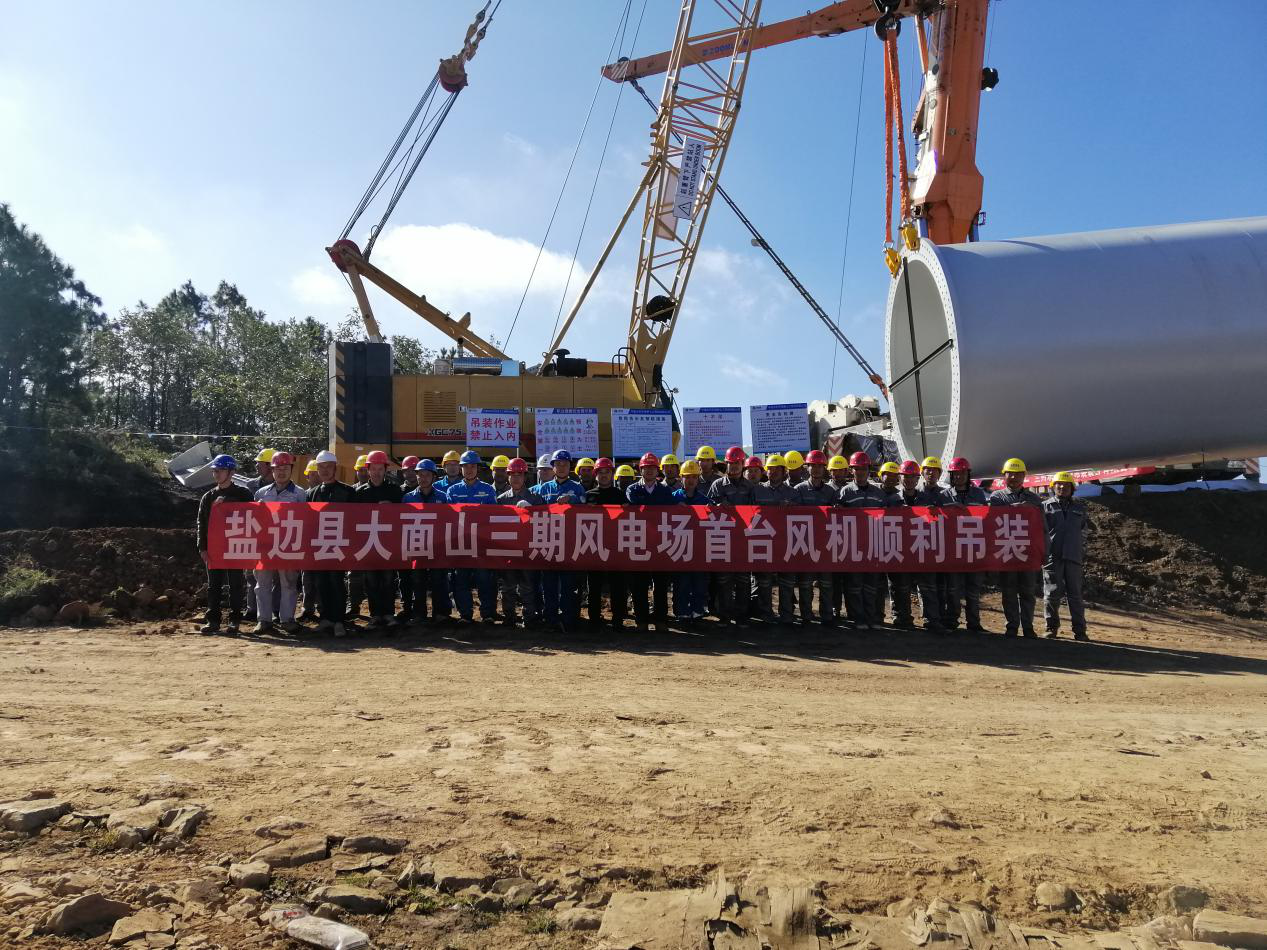 2019年11月15日10点58分,川能风电盐边大面山三期风电项目首台风机开始吊装,标志着大面山三期风电项目正式转入主机设备安装施工阶段。