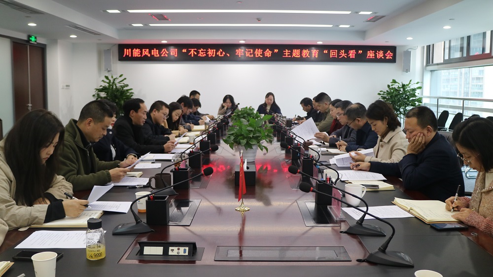 2019年11月18日,川能风电公司党委召开“不忘初心 牢记使命”主题教育整改落实“回头看”座谈会。公司领导班子成员、各部门负责人、员工代表、主题教育领导小组办公室成员参加会议。会议进一步传达学习省委和国资委党委、集团党委关于主题教育整改落实“回头看”工作有关文件和会议精神,就公司党委《关于开展主题教育整改落实情况“回头看”自查工作方案》进行宣讲。