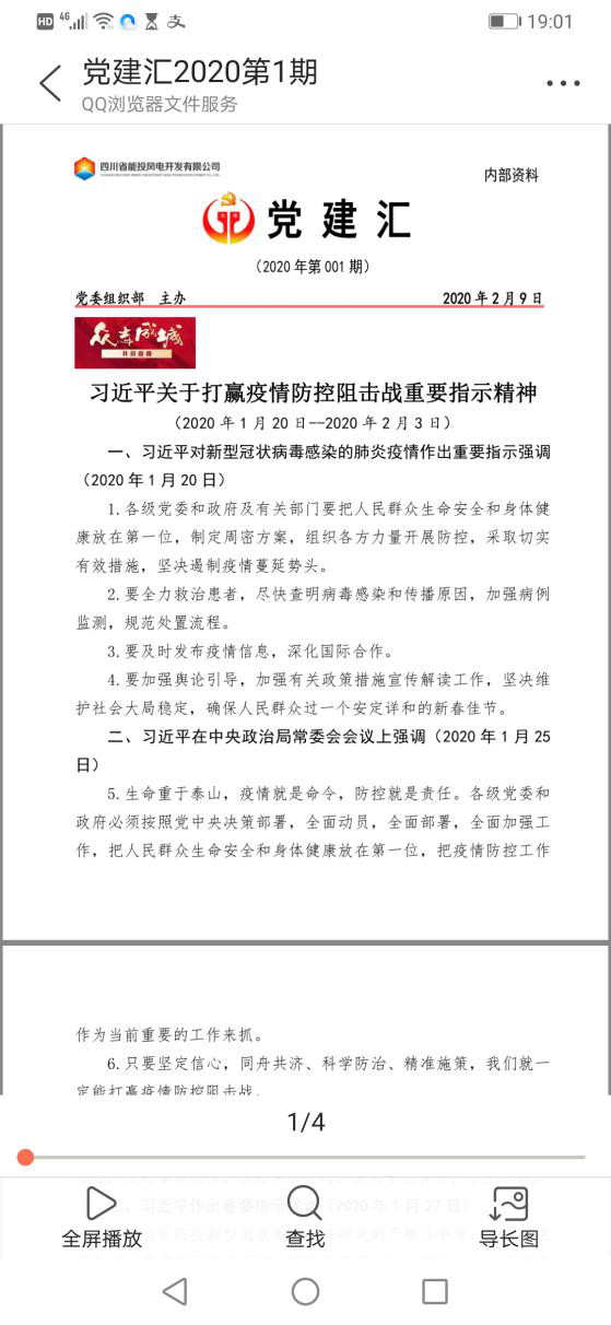 为此,公司党委组织部整理编辑《党建汇·疫情防控特辑》,及时传达学习习近平总书记重要讲话精神,并就加强疫情防控工作在公司组织学习教育,要求全体党员干部要深刻认识到做好疫情防控工作的重要性和紧迫性,把思想和行动统一到中央的决策部署上来。公司纪委推出《党风廉政建设学习园地》,内容涵盖近期反腐倡廉新闻、重要文件精神,违规违纪以及在抗击疫情斗争中不担当不作为、失职渎职、造谣传谣等典型案例,通过公司“能投风光”微信群组织全体党员干部和职工进行学习。
