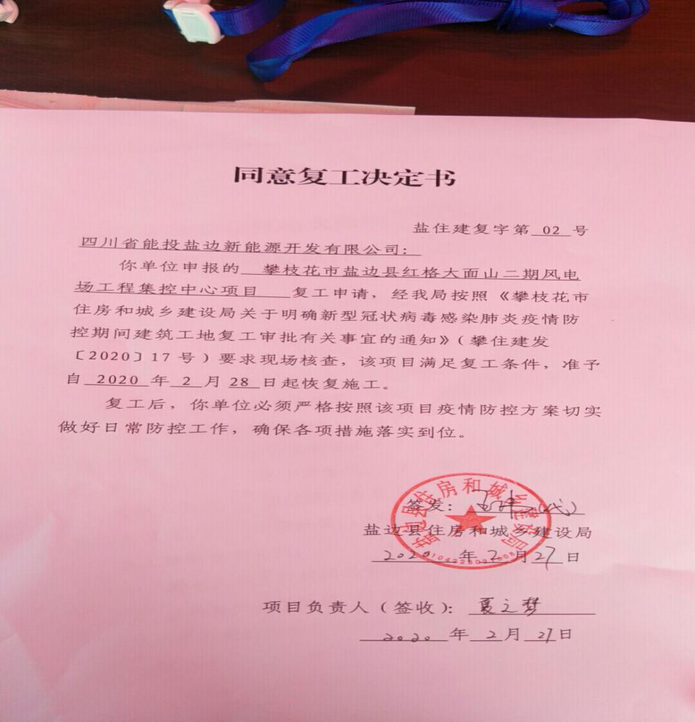 2020年2月27日,川能风电盐边大面山风电场二期集控中心工程项目通过了盐边县住建局及卫健局组织的疫情防控现场检查,并取得盐边县住房和城乡建设局关于疫情后恢复生产的批复,成为盐边县疫情期间第二个取得住建局复工批复的企业。至此,大面山风电场二期集控中心工程全面恢复施工。