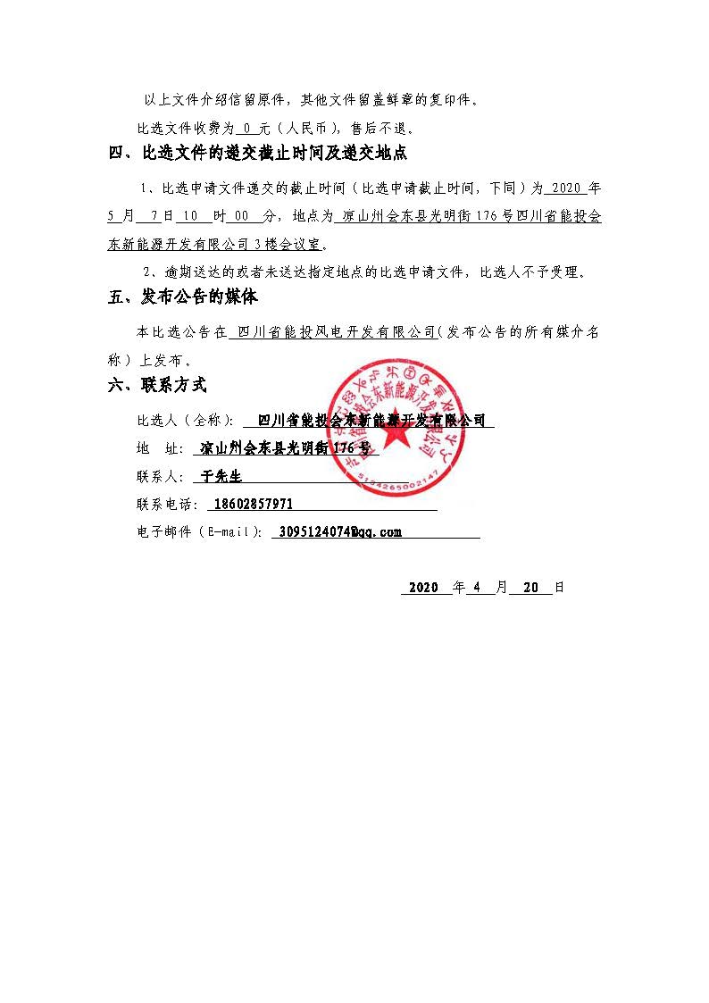 1、比选申请文件递交的截止时间(比选申请截止时间,下同)为 2020 年 5 月 7日 10 时 00 分,地点为 凉山州会东县光明街176号四川省能投会东新能源开发有限公司3楼会议室。