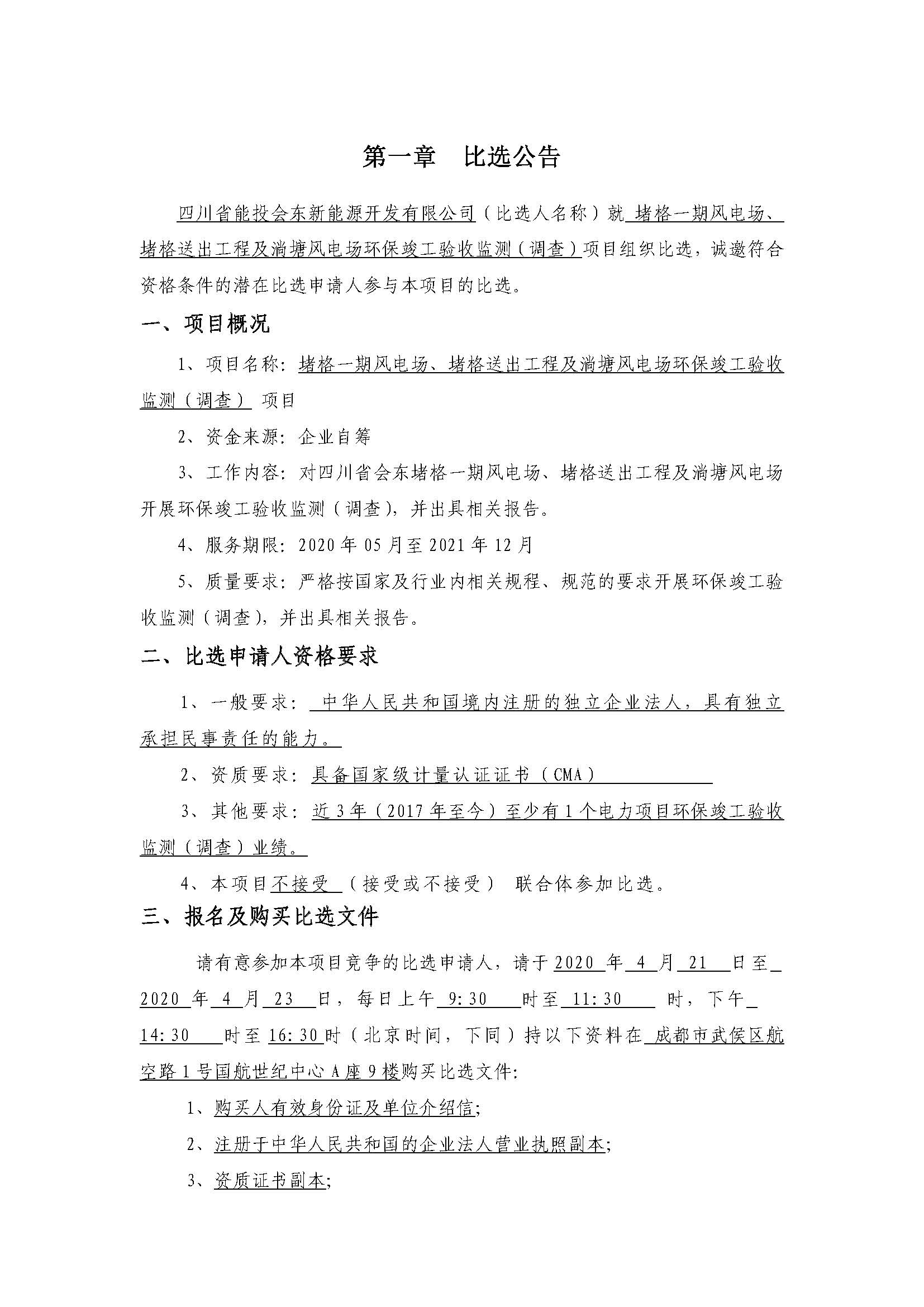 四川省能投会东新能源开发有限公司(比选人名称)就 堵格一期风电场、堵格送出工程及淌塘风电场环保竣工验收监测(调查)项目组织比选,诚邀符合资格条件的潜在比选申请人参与本项目的比选。