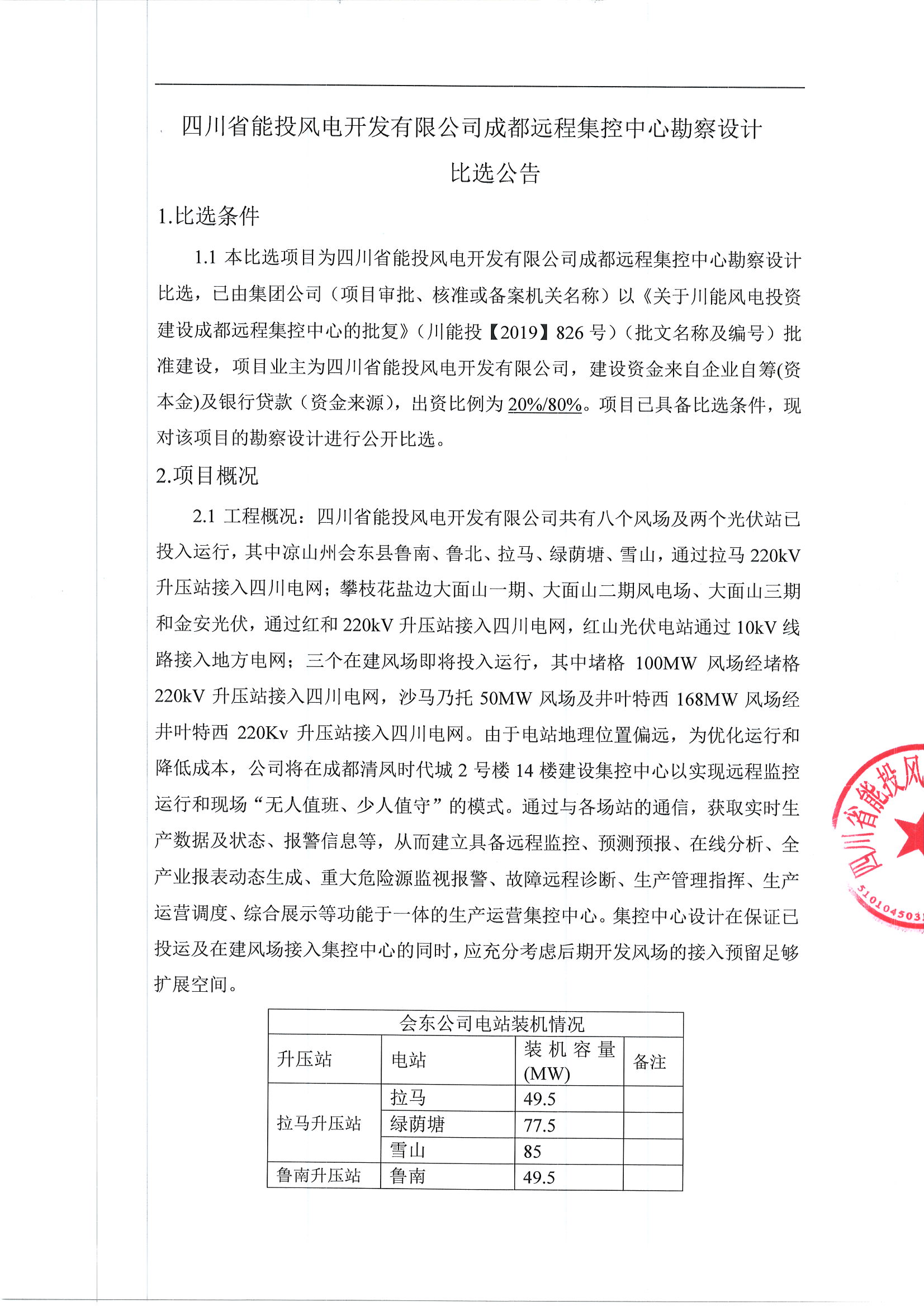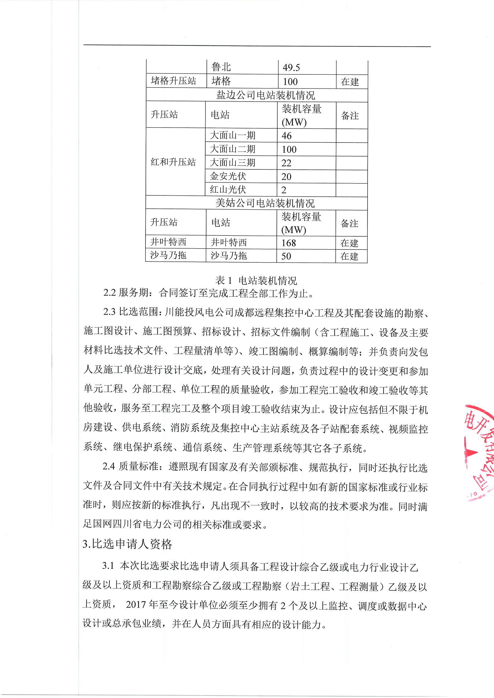 2.3比选范围:川能投风电公司成都远程集控中心工程及其配套设施的勘察、施工图设计、施工图预算、招标设计、招标文件编制(含工程施工、设备及主要材料比选技术文件、工程量清单等)、竣工图编制、概算编制等;并负责向发包人及施工单位进行设计交底,处理有关设计问题,负责过程中的设计变更和参加单元工程、分部工程、单位工程的质量验收,参加工程完工验收和竣工验收等其他验收,服务至工程完工及整个项目竣工验收结束为止。设计应包括但不限于机房建设、供电系统、消防系统及集控中心主站系统及各子站配套系统、视频监控系统、继电保护系统、通信系统、生产管理系统等其它各子系统。