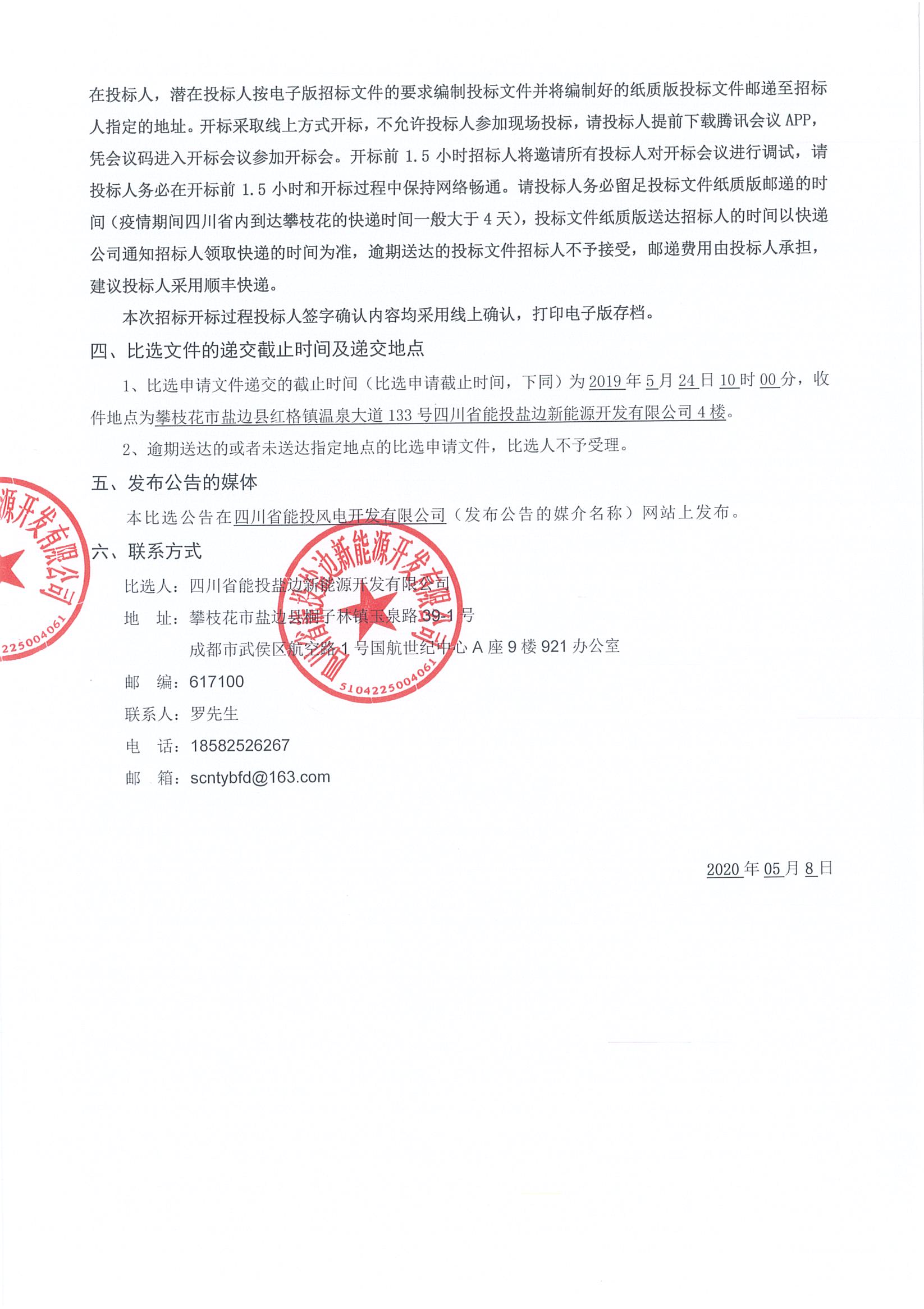 1、比选申请文件递交的截止时间(比选申请截止时间,下同)为2019年5月24日10时00分,收件地点为攀枝花市盐边县红格镇温泉大道133号四川省能投盐边新能源开发有限公司4楼。