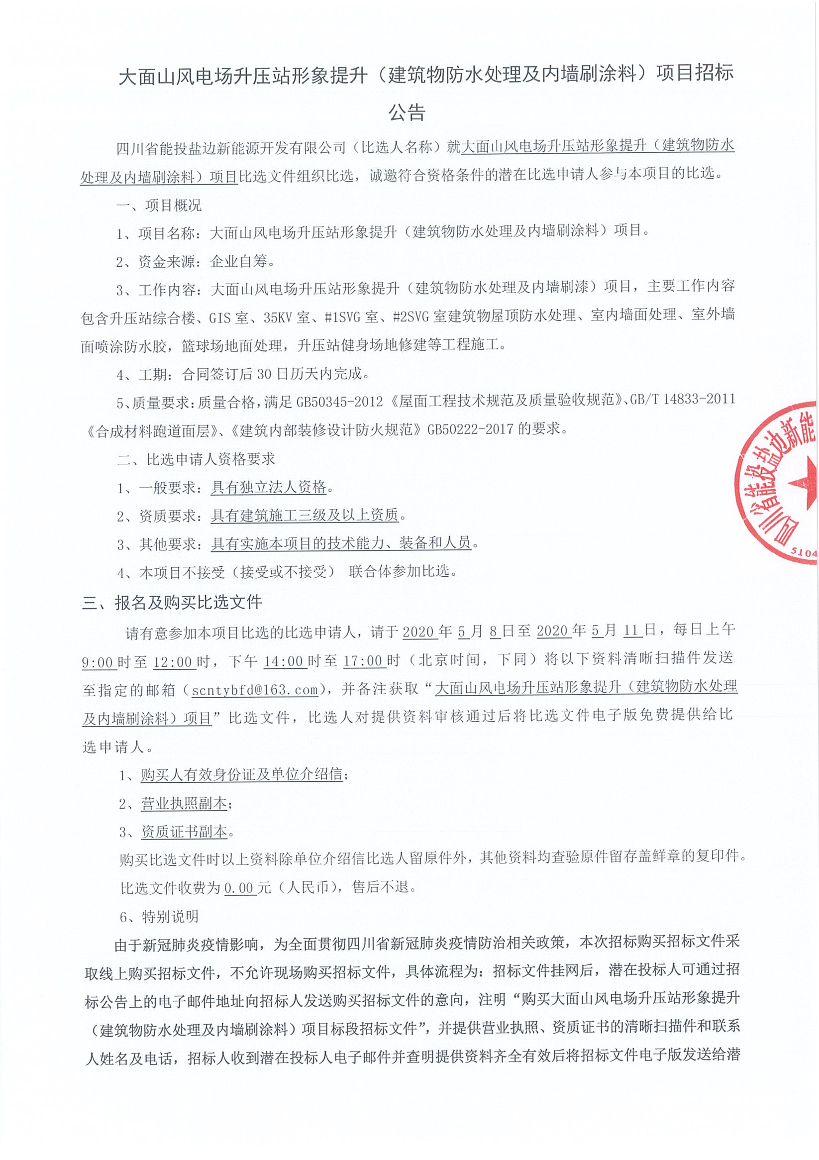 四川省能投盐边新能源开发有限公司(比选人名称)就大面山风电场升压站形象提升(建筑物防水处理及内墙刷涂料)项目比选文件组织比选,诚邀符合资格条件的潜在比选申请人参与本项目的比选。