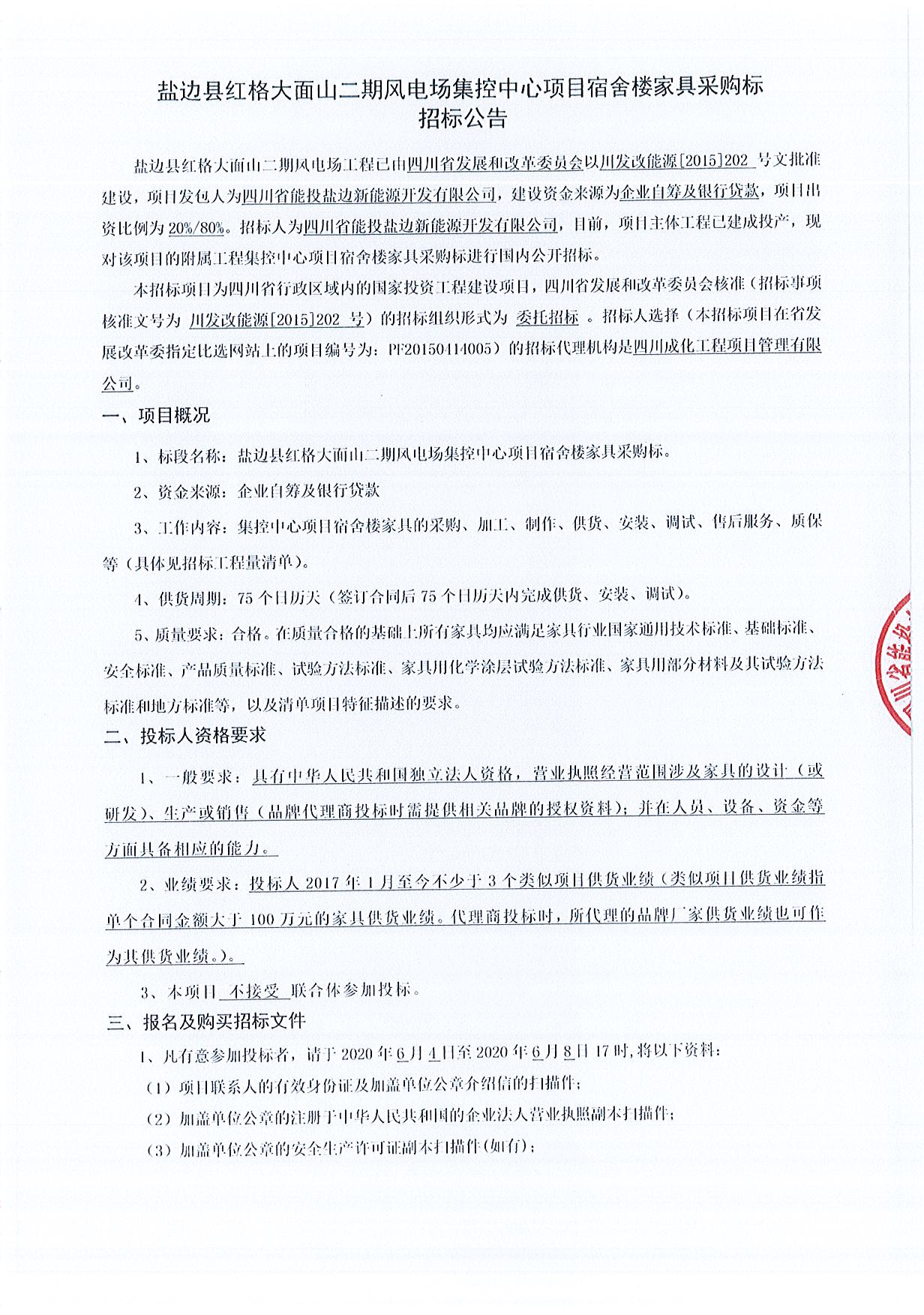 盐边县红格大面山二期风电场工程已由四川省发展和改革委员会以川发改能源[2015]202号文批准建设,项目发包人为四川省能投盐边新能源开发有限公司,建设资金来源为企业自筹及银行贷款,项目出资比例为20%/80%。招标人为四川省能投盐边新能源开发有限公司,目前,项目主体工程已建成投产,现对该项目的附属工程集控中心项目宿舍楼家具采购标进行国内公开招标。