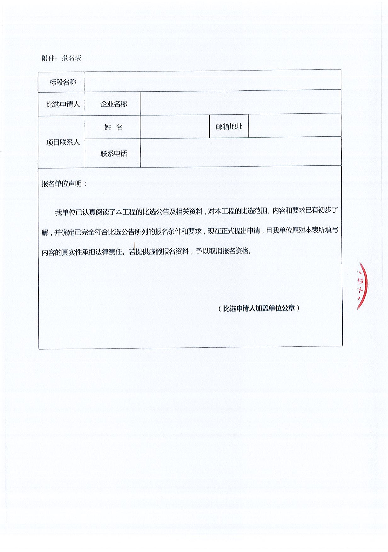 报名单位声明: 我单位已认真阅读了本工程的比选公告及相关资料,对本工程的比选范围、内容和要求已有初步了解,并确定已完全符合比选公告所列的报名条件和要求,现在正式提出申请,且我单位愿对本表所填写内容的真实性承担法律责任。若提供虚假报名资料,予以取消报名资格。