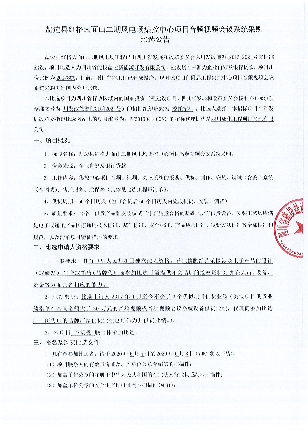 盐边县红格大面山二期风电场工程已由四川省发展和改革委员会以川发改能源[2015]202号文批准建设,项目比选人为四川省能投盐边新能源开发有限公司,建设资金来源为企业自筹及银行贷款,项目出资比例为20%/80%。目前,项目主体工程已建成投产,现对该项目的附属工程集控中心项目音频视频会议系统采购进行国内公开比选。