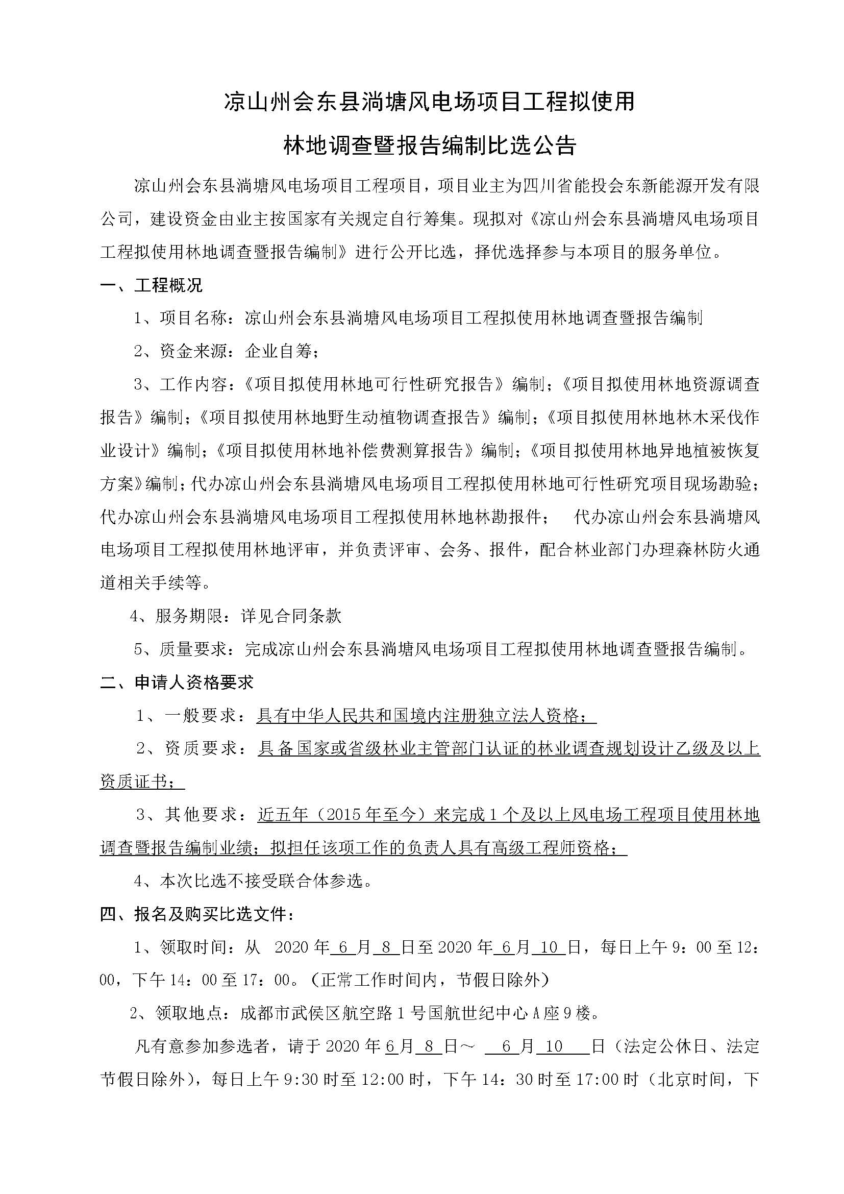 凉山州会东县淌塘风电场项目工程项目,项目业主为四川省能投会东新能源开发有限公司,建设资金由业主按国家有关规定自行筹集。现拟对《凉山州会东县淌塘风电场项目工程拟使用林地调查暨报告编制》进行公开比选,择优选择参与本项目的服务单位。