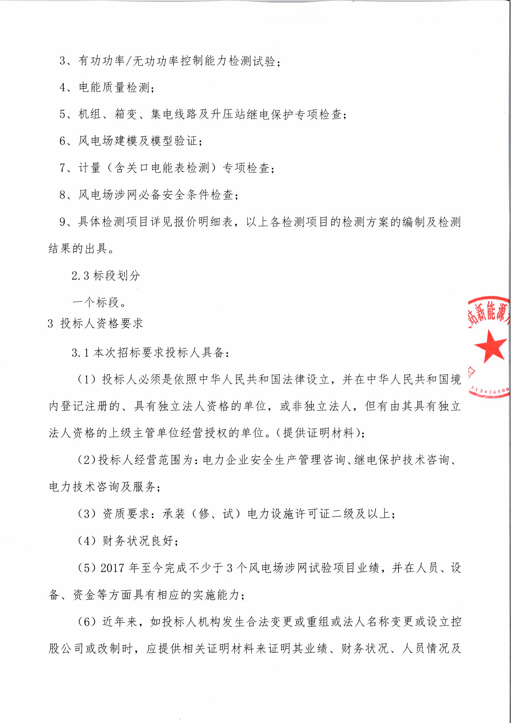 (5)2017年至今完成不少于3个风电场涉网试验项目业绩,并在人员、设备、资金等方面具有相应的实施能力;
