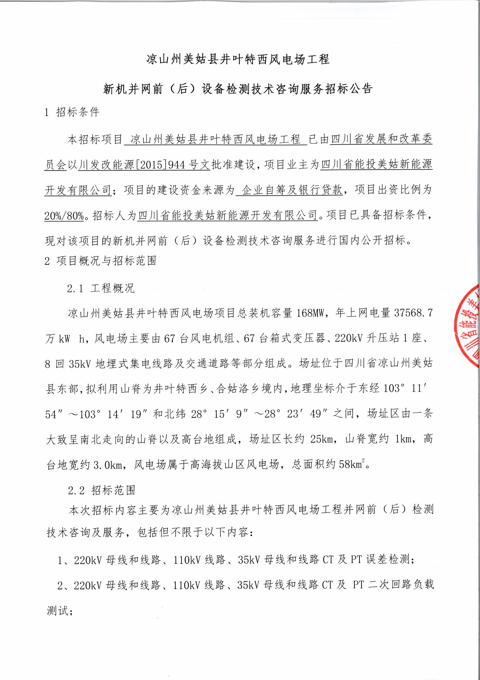本招标项目 凉山州美姑县井叶特西风电场工程 已由四川省发展和改革委员会以川发改能源[2015]944号文批准建设,项目业主为四川省能投美姑新能源开发有限公司;项目的建设资金来源为 企业自筹及银行贷款,项目出资比例为20%/80%。招标人为四川省能投美姑新能源开发有限公司。项目已具备招标条件,现对该项目的新机并网前(后)设备检测技术咨询服务进行国内公开招标。