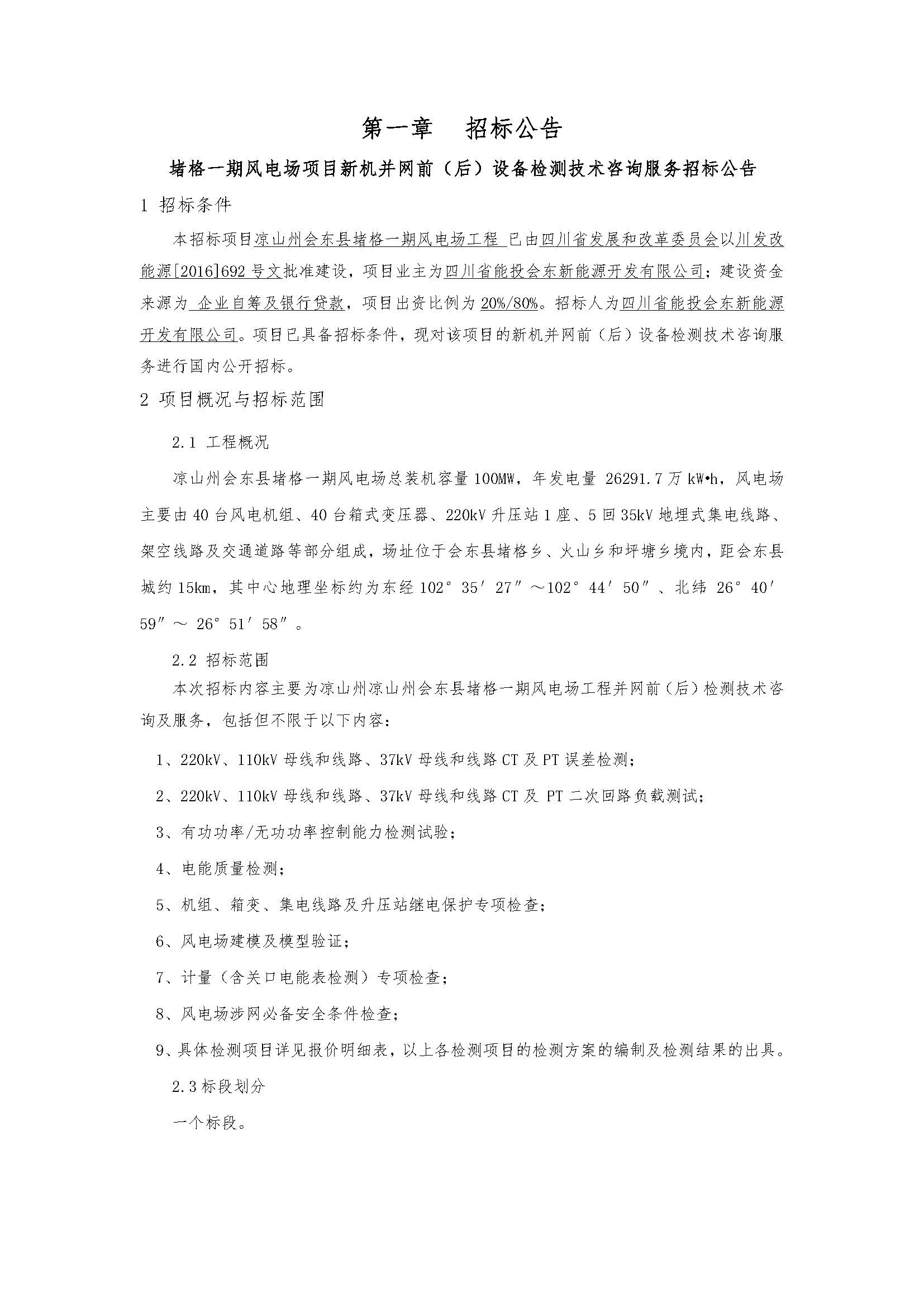 本招标项目凉山州会东县堵格一期风电场工程 已由四川省发展和改革委员会以川发改能源[2016]692号文批准建设,项目业主为四川省能投会东新能源开发有限公司;建设资金来源为 企业自筹及银行贷款,项目出资比例为20%/80%。招标人为四川省能投会东新能源开发有限公司。项目已具备招标条件,现对该项目的新机并网前(后)设备检测技术咨询服务进行国内公开招标。