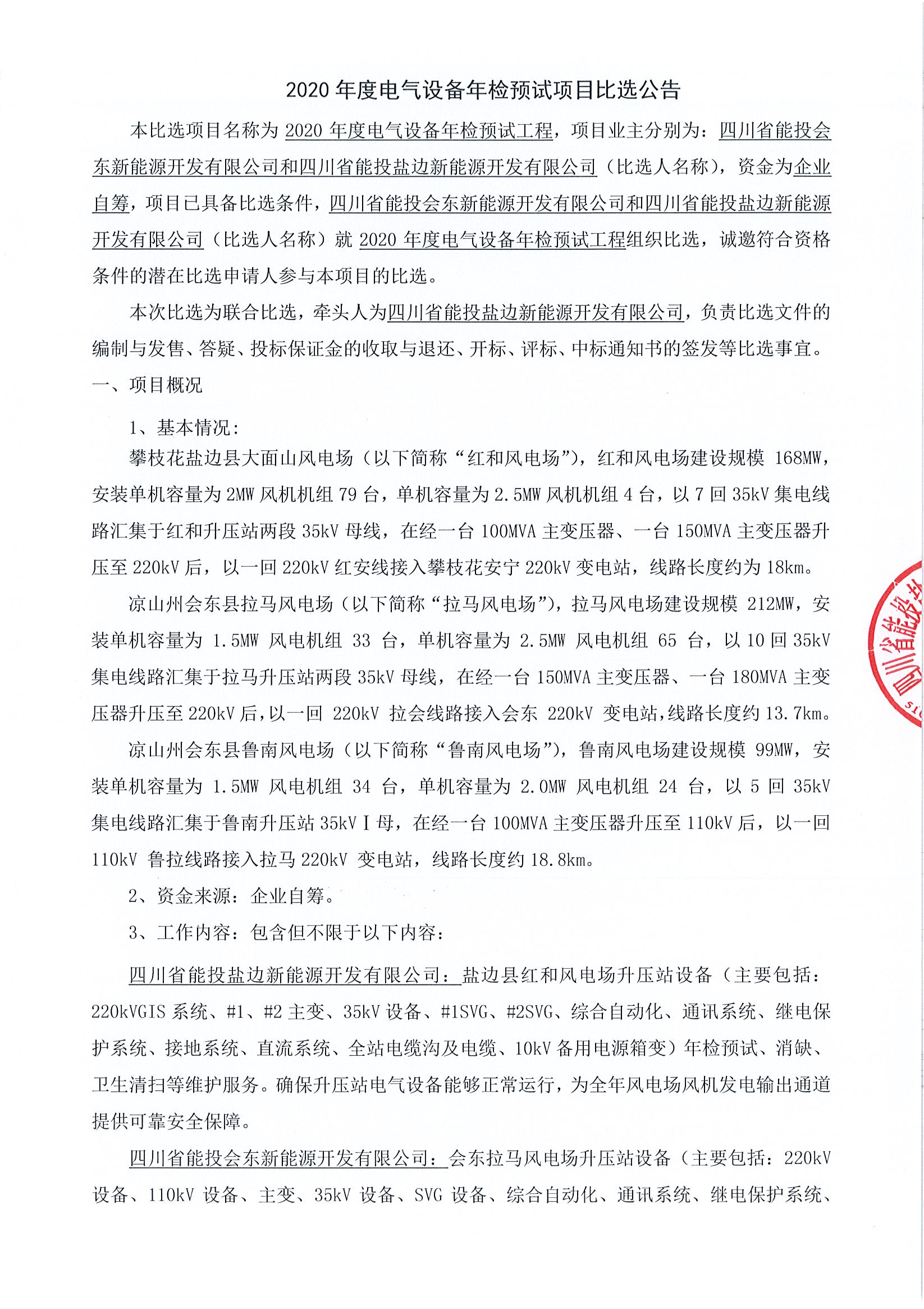 本比选项目名称为2020年度电气设备年检预试工程,项目业主分别为:四川省能投会东新能源开发有限公司和四川省能投盐边新能源开发有限公司(比选人名称),资金为企业自筹,项目已具备比选条件,四川省能投会东新能源开发有限公司和四川省能投盐边新能源开发有限公司(比选人名称)就2020年度电气设备年检预试工程组织比选,诚邀符合资格条件的潜在比选申请人参与本项目的比选。