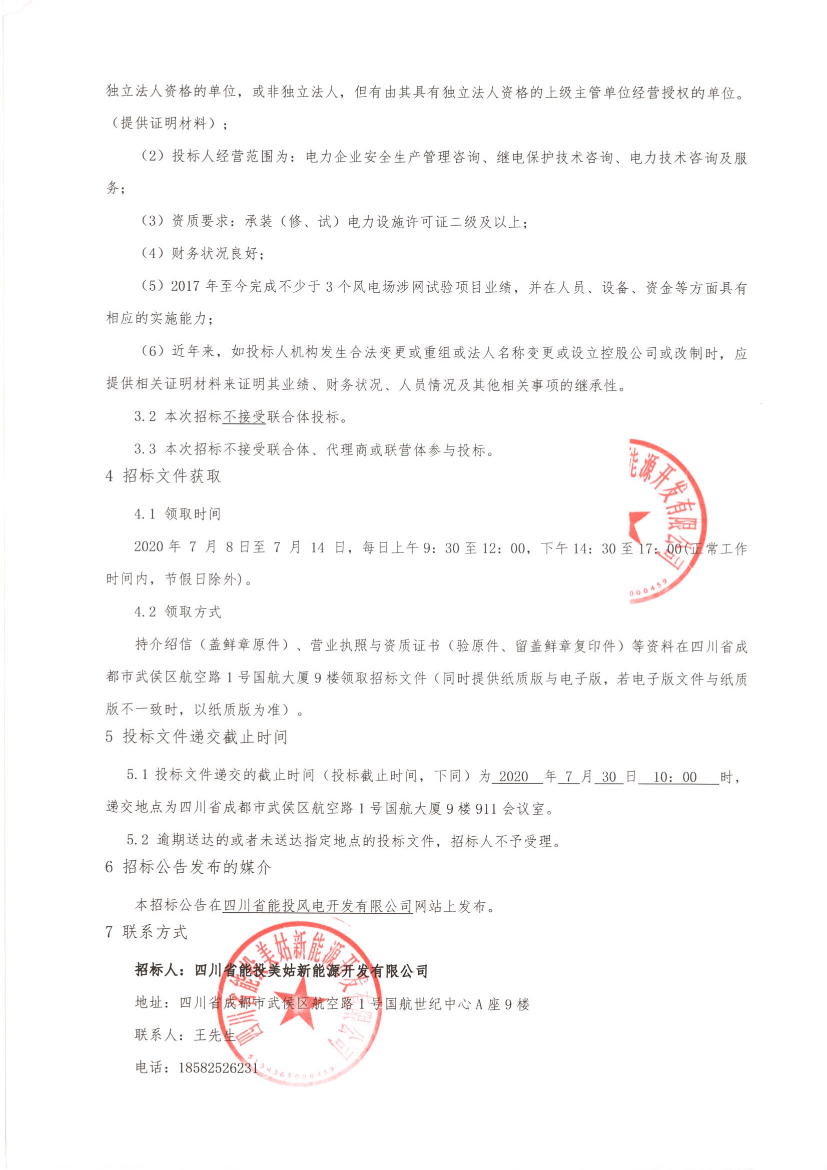 (5)2017年至今完成不少于3个风电场涉网试验项目业绩,并在人员、设备、资金等方面具有相应的实施能力;