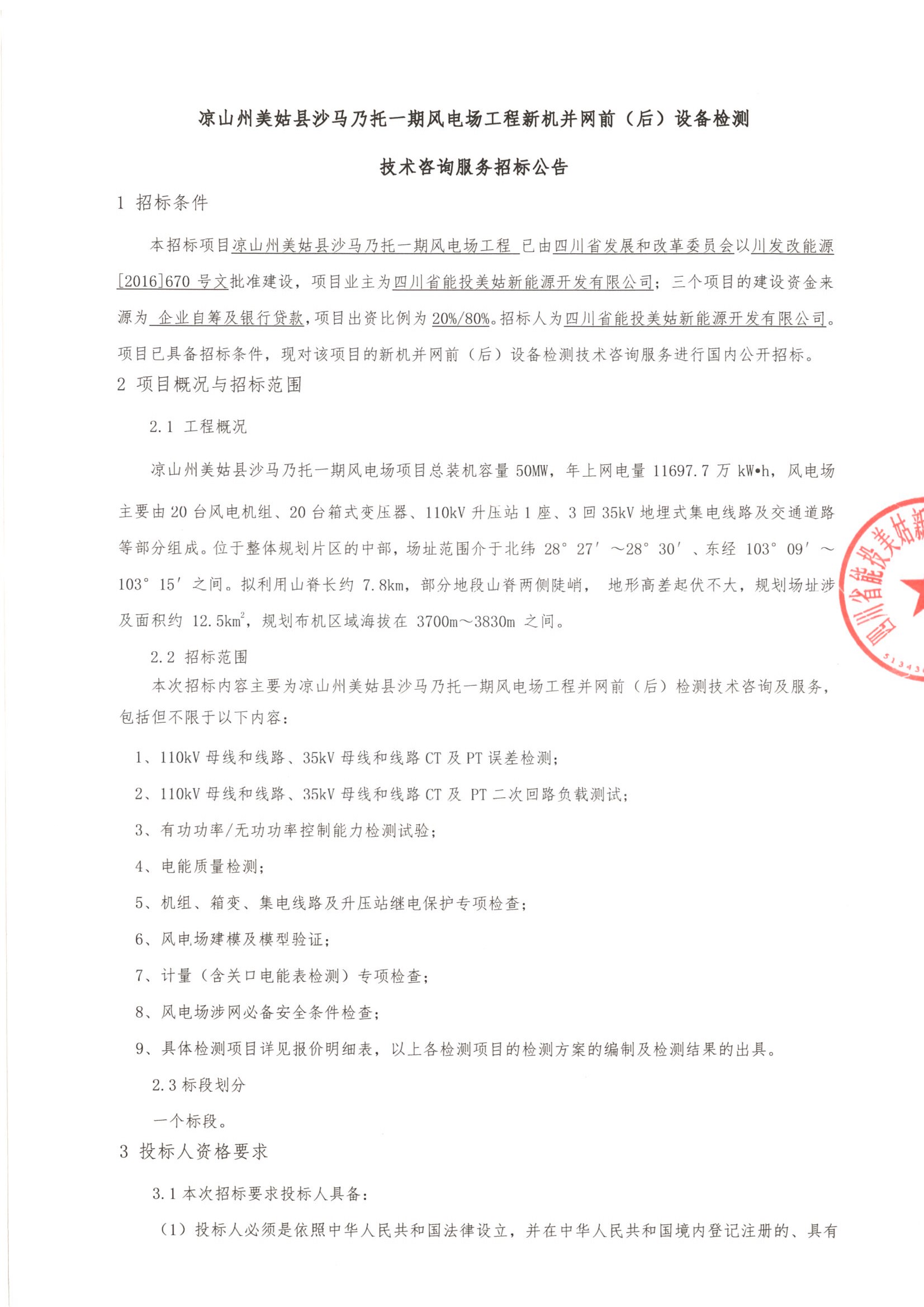 本招标项目凉山州美姑县沙马乃托一期风电场工程 已由四川省发展和改革委员会以川发改能源[2016]670号文批准建设,项目业主为四川省能投美姑新能源开发有限公司;三个项目的建设资金来源为 企业自筹及银行贷款,项目出资比例为20%/80%。招标人为四川省能投美姑新能源开发有限公司。项目已具备招标条件,现对该项目的新机并网前(后)设备检测技术咨询服务进行国内公开招标。
