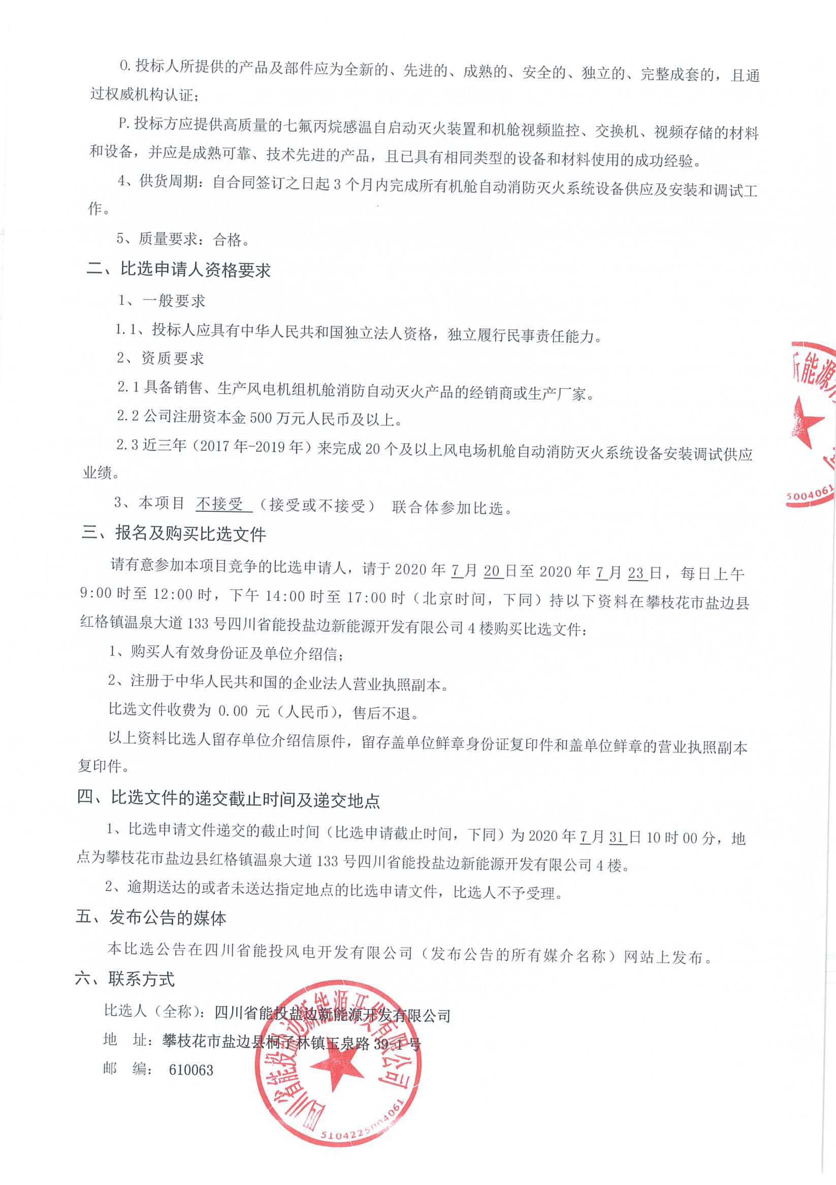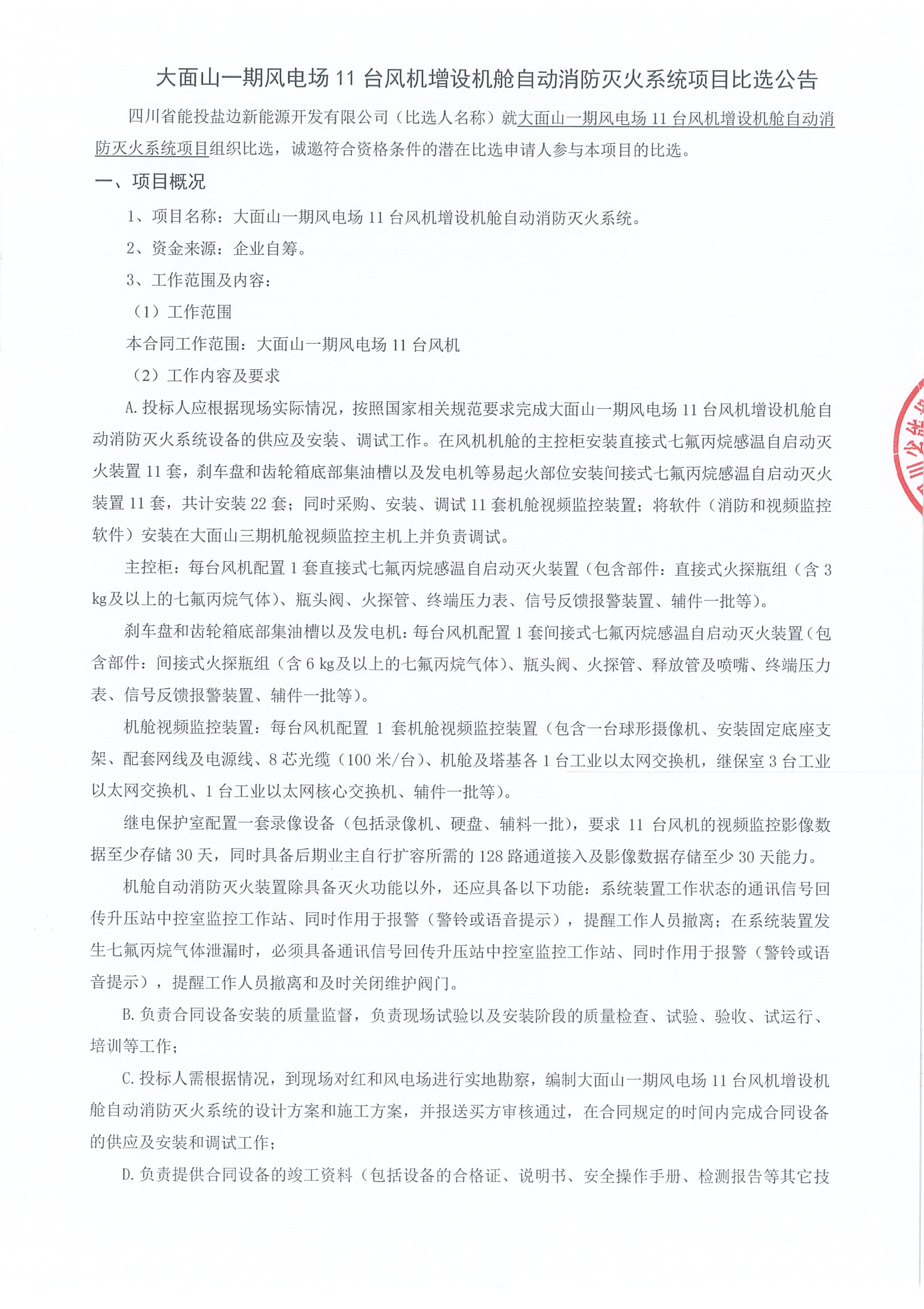 四川省能投盐边新能源开发有限公司(比选人名称)就大面山一期风电场11台风机增设机舱自动消防灭火系统项目组织比选,诚邀符合资格条件的潜在比选申请人参与本项目的比选。