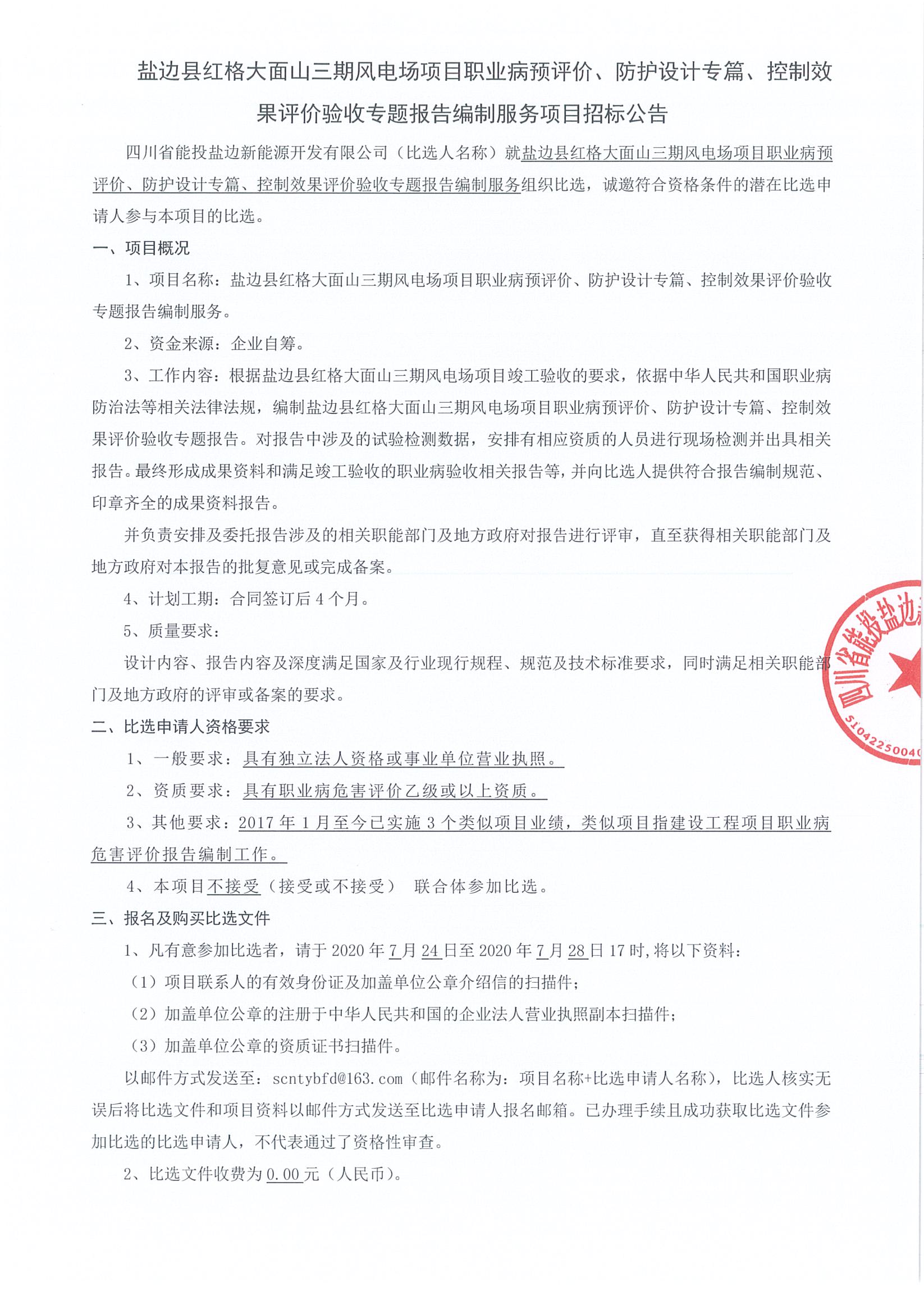 1、项目名称:盐边县红格大面山三期风电场项目职业病预评价、防护设计专篇、控制效果评价验收专题报告编制服务。