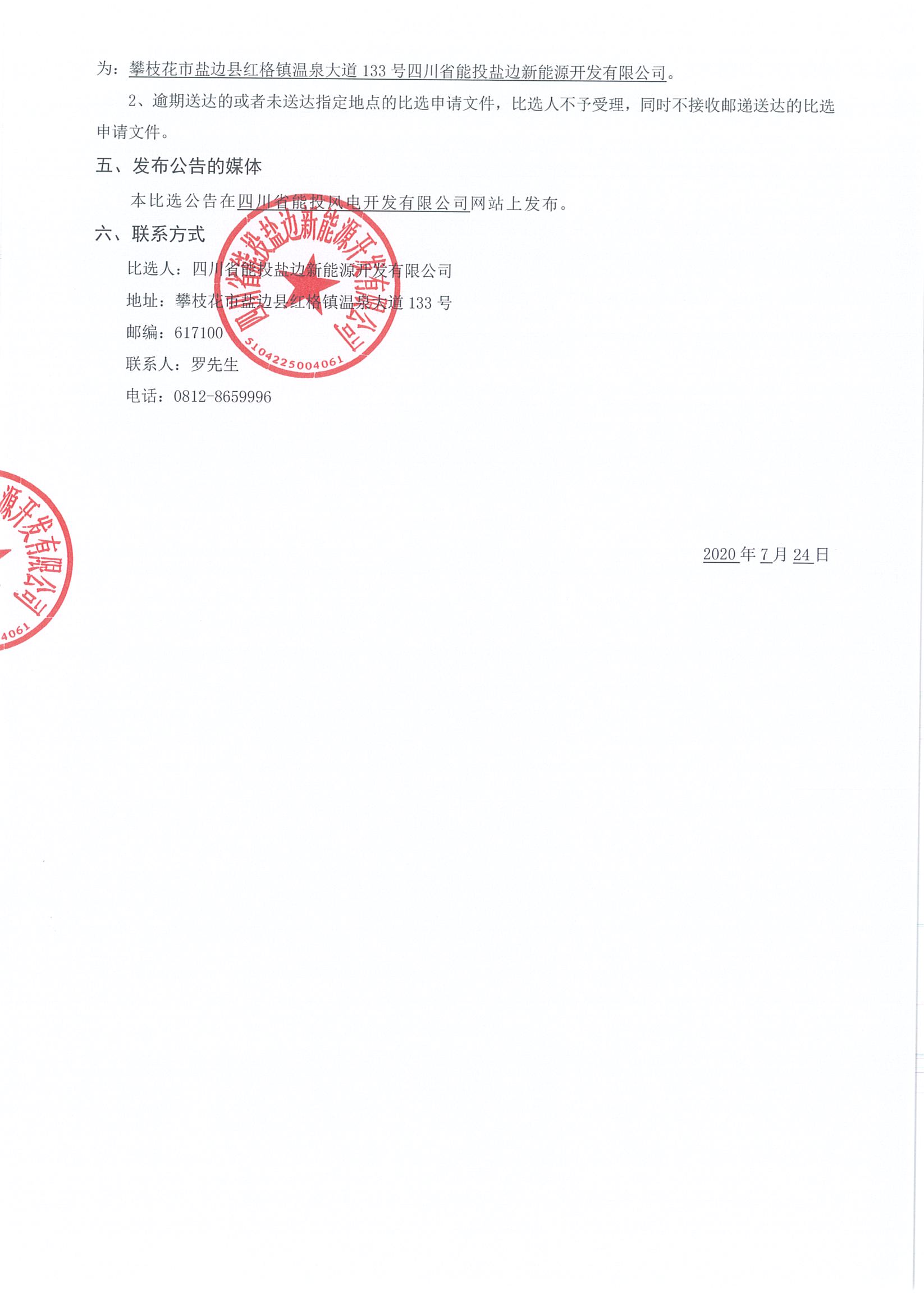 1、比选申请文件递交的截止时间(比选截止时间,下同)为2020年8月6日09:30 时,递交地点为:攀枝花市盐边县红格镇温泉大道133号四川省能投盐边新能源开发有限公司。