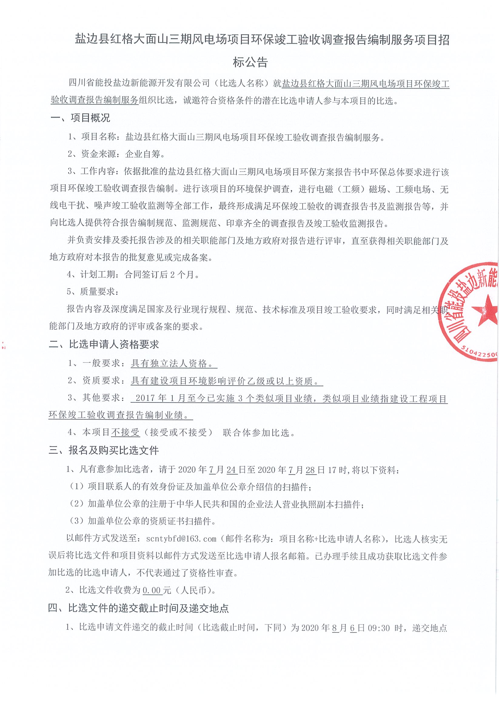 四川省能投盐边新能源开发有限公司(比选人名称)就盐边县红格大面山三期风电场项目环保竣工验收调查报告编制服务组织比选,诚邀符合资格条件的潜在比选申请人参与本项目的比选。