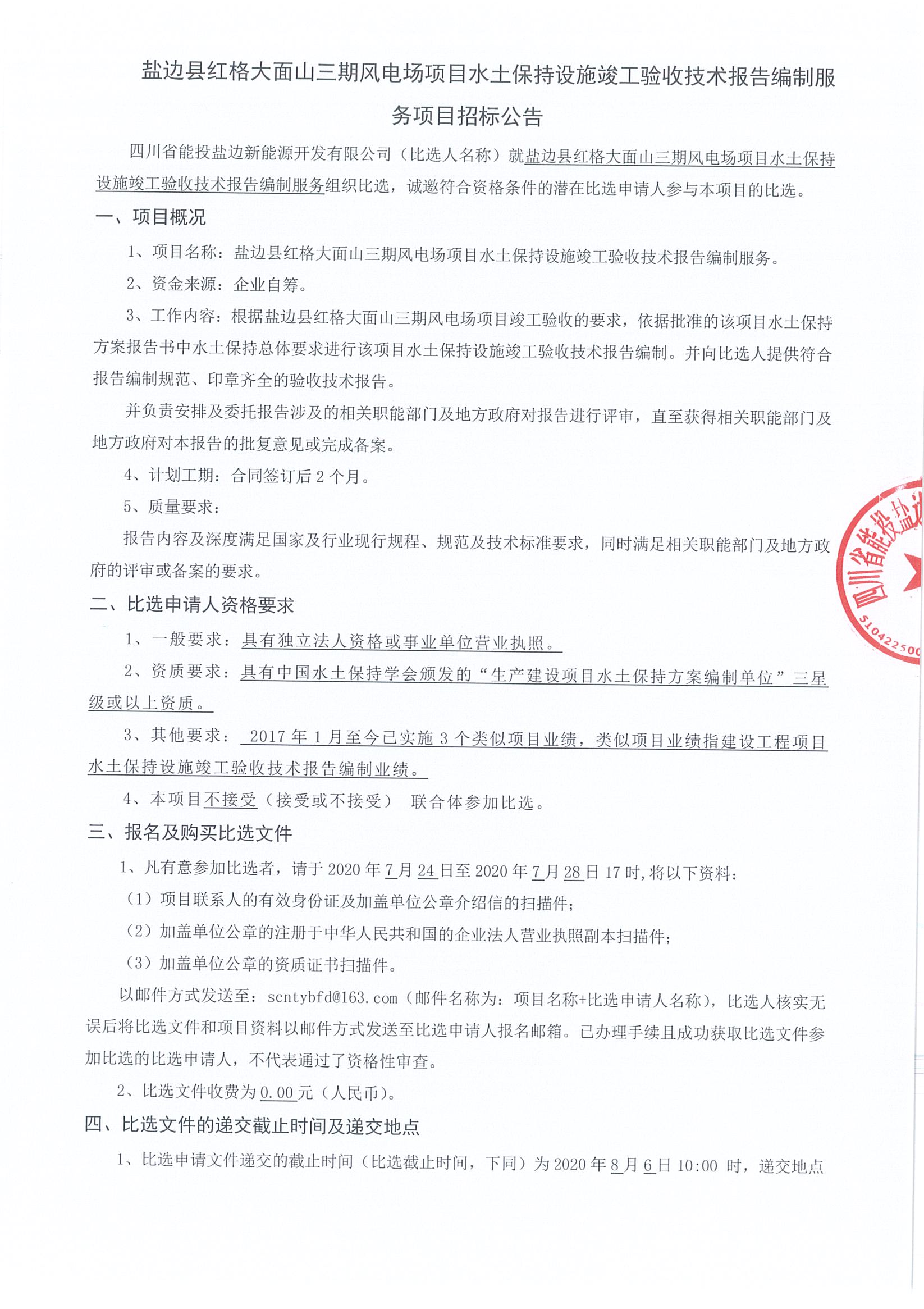 四川省能投盐边新能源开发有限公司(比选人名称)就盐边县红格大面山三期风电场项目水土保持设施竣工验收技术报告编制服务组织比选,诚邀符合资格条件的潜在比选申请人参与本项目的比选。
