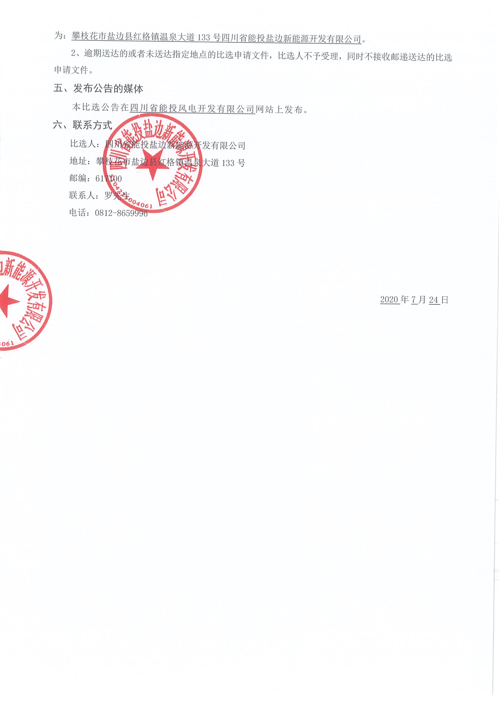 1、比选申请文件递交的截止时间(比选截止时间,下同)为2020年8月6日10:00 时,递交地点为:攀枝花市盐边县红格镇温泉大道133号四川省能投盐边新能源开发有限公司。