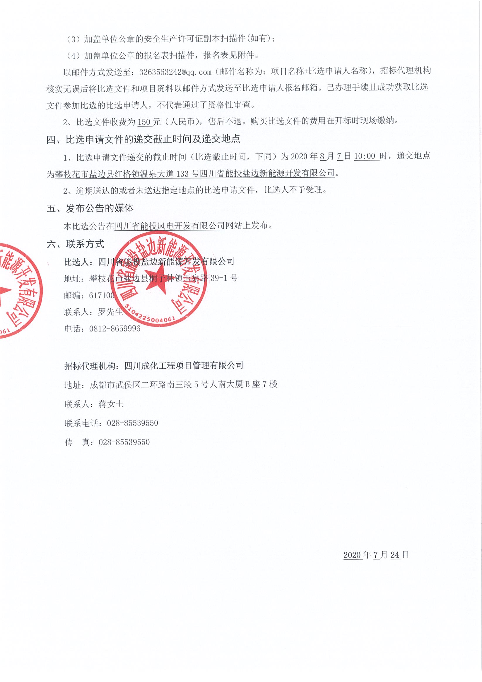 1、比选申请文件递交的截止时间(比选截止时间,下同)为2020年8月7日10:00 时,递交地点为攀枝花市盐边县红格镇温泉大道133号四川省能投盐边新能源开发有限公司。