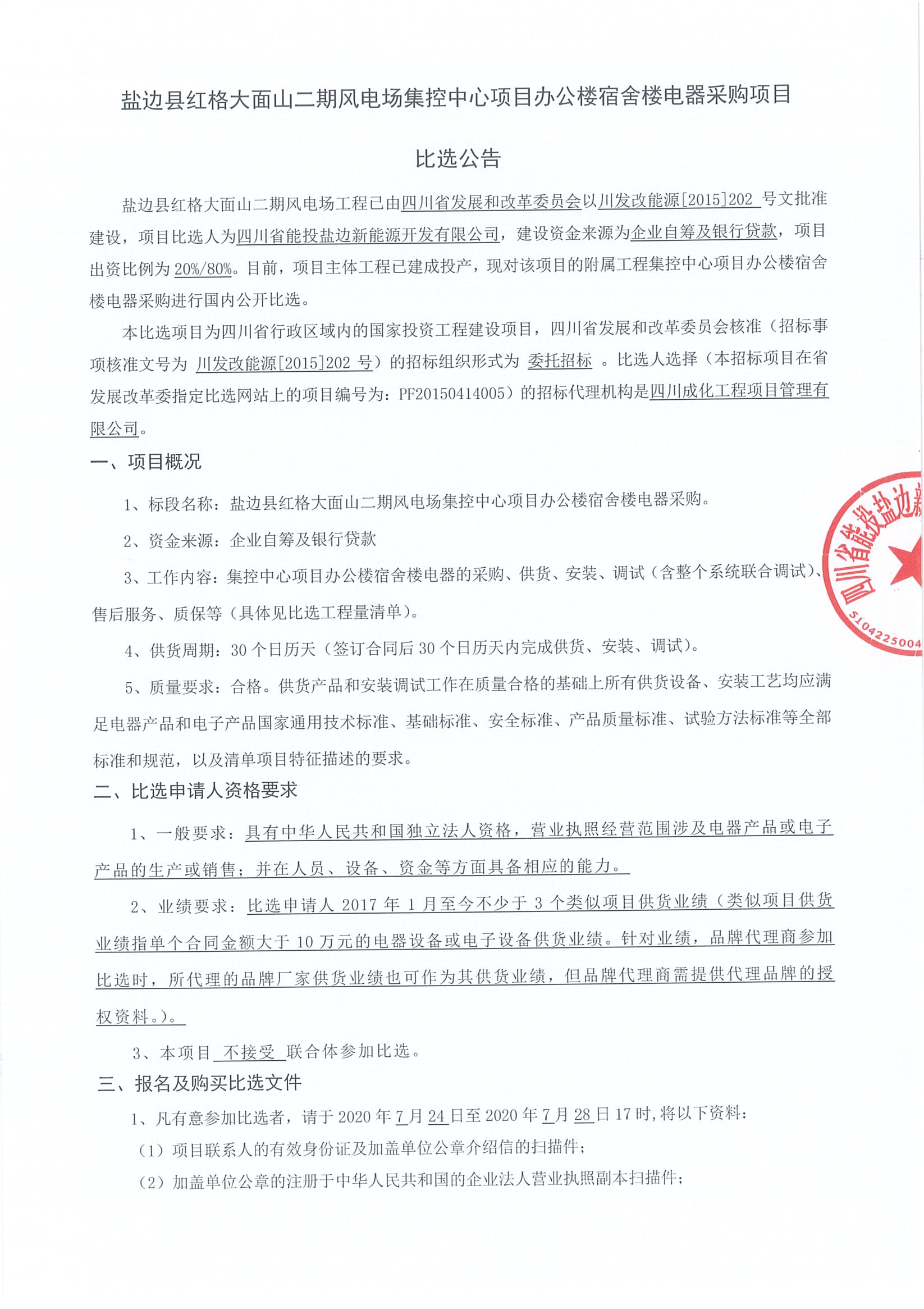 盐边县红格大面山二期风电场工程已由四川省发展和改革委员会以川发改能源[2015]202号文批准建设,项目比选人为四川省能投盐边新能源开发有限公司,建设资金来源为企业自筹及银行贷款,项目出资比例为20%/80%。目前,项目主体工程已建成投产,现对该项目的附属工程集控中心项目办公楼宿舍楼电器采购进行国内公开比选。