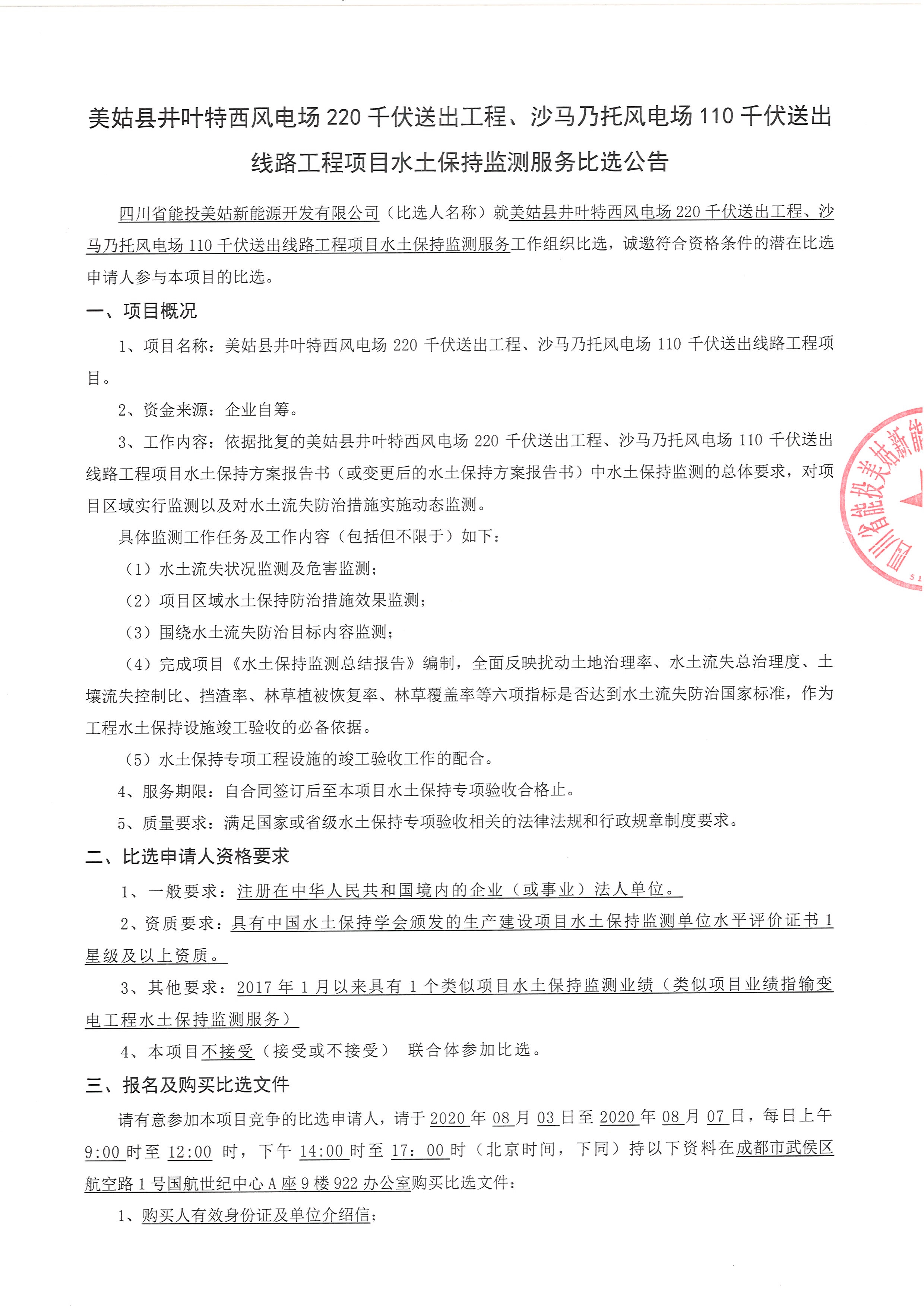 四川省能投美姑新能源开发有限公司(比选人名称)就美姑县井叶特西风电场220千伏送出工程、沙马乃托风电场110千伏送出线路工程项目水土保持监测服务工作组织比选,诚邀符合资格条件的潜在比选申请人参与本项目的比选。