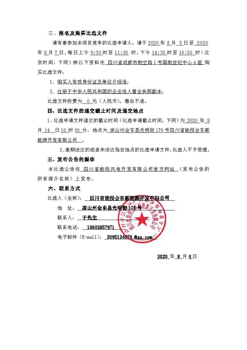 1、比选申请文件递交的截止时间(比选申请截止时间,下同)为 2020 年 8月 14 日10 时00 分,地点为 凉山州会东县光明街176号四川省能投会东新能源开发有限公司 。