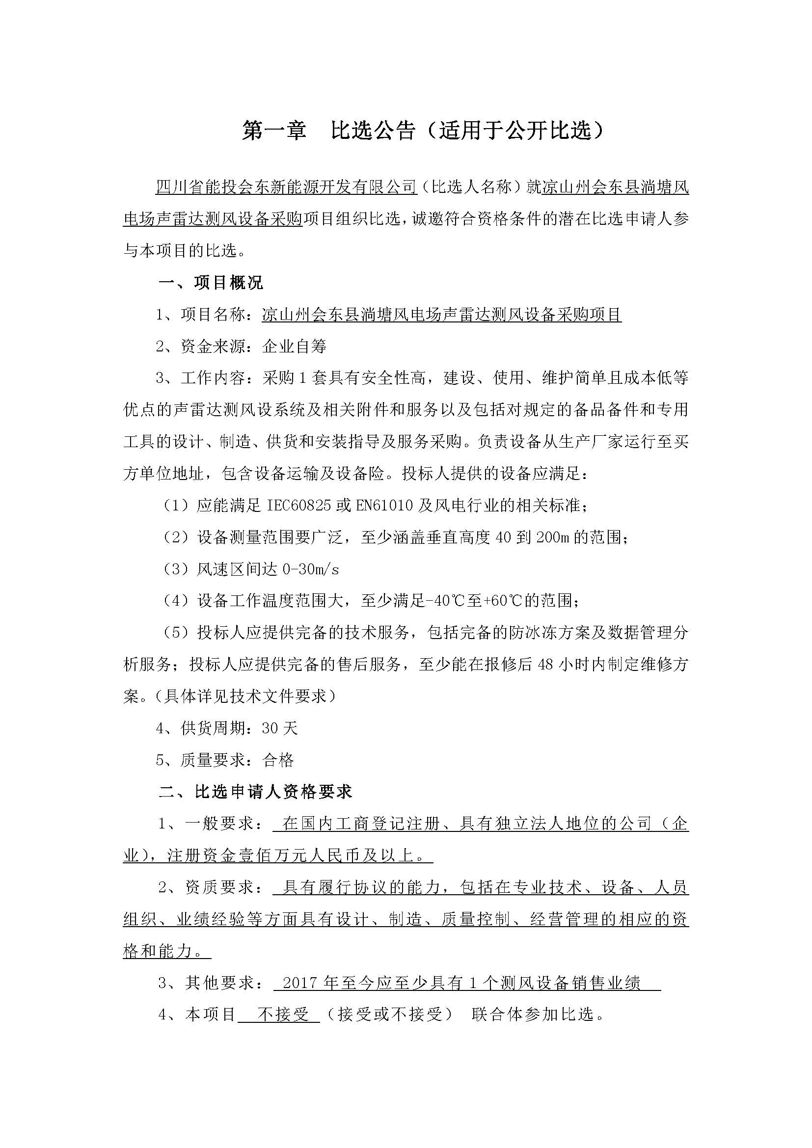 四川省能投会东新能源开发有限公司(比选人名称)就凉山州会东县淌塘风电场声雷达测风设备采购项目组织比选,诚邀符合资格条件的潜在比选申请人参与本项目的比选。