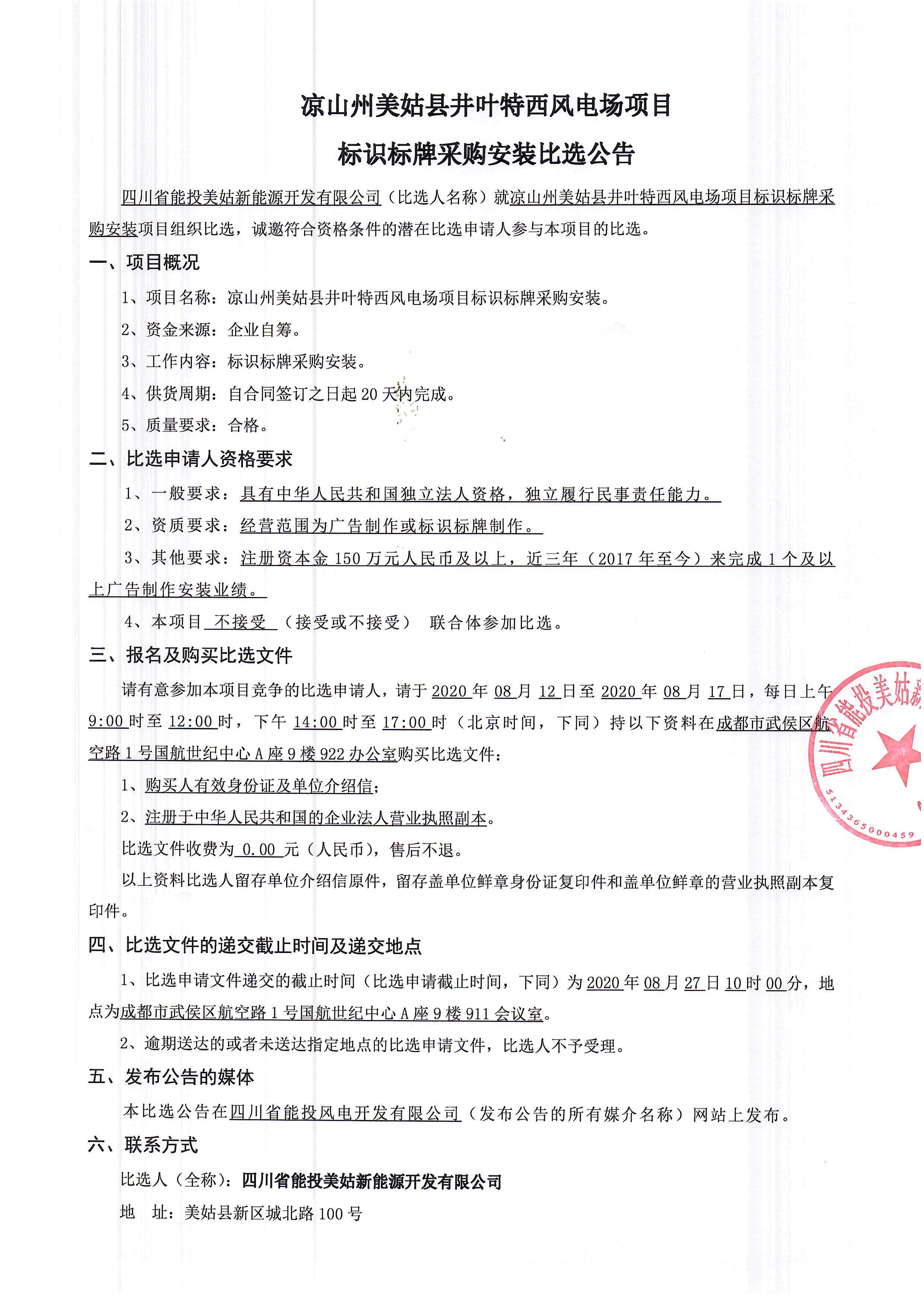 四川省能投美姑新能源开发有限公司(比选人名称)就凉山州美姑县井叶特西风电场项目标识标牌采购安装项目组织比选,诚邀符合资格条件的潜在比选申请人参与本项目的比选。