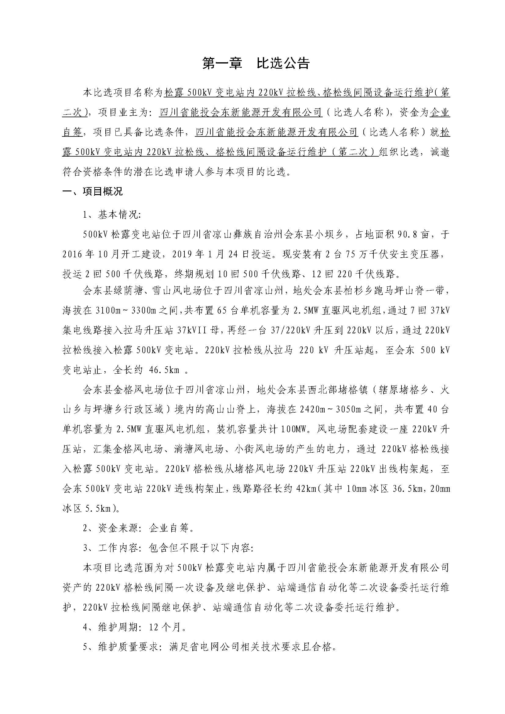 本项目比选范围为对500kV松露变电站内属于四川省能投会东新能源开发有限公司资产的220kV格松线间隔一次设备及继电保护、站端通信自动化等二次设备委托运行维护,220kV拉松线间隔继电保护、站端通信自动化等二次设备委托运行维护。