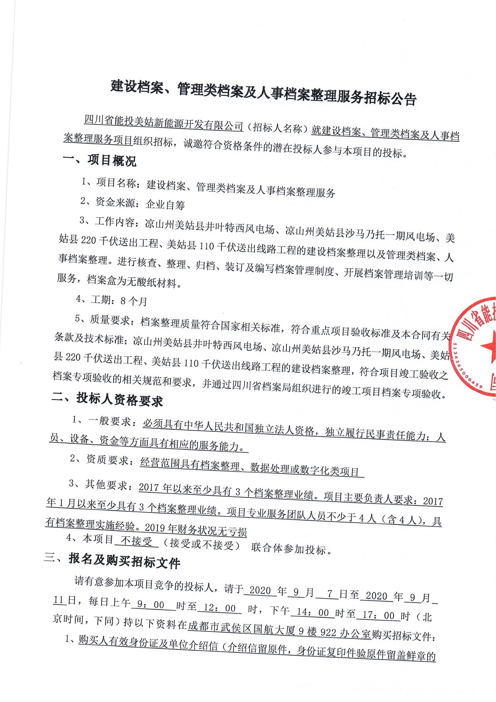四川省能投美姑新能源开发有限公司(招标人名称)就建设档案、管理类档案及人事档案整理服务项目组织招标,诚邀符合资格条件的潜在投标人参与本项目的投标。