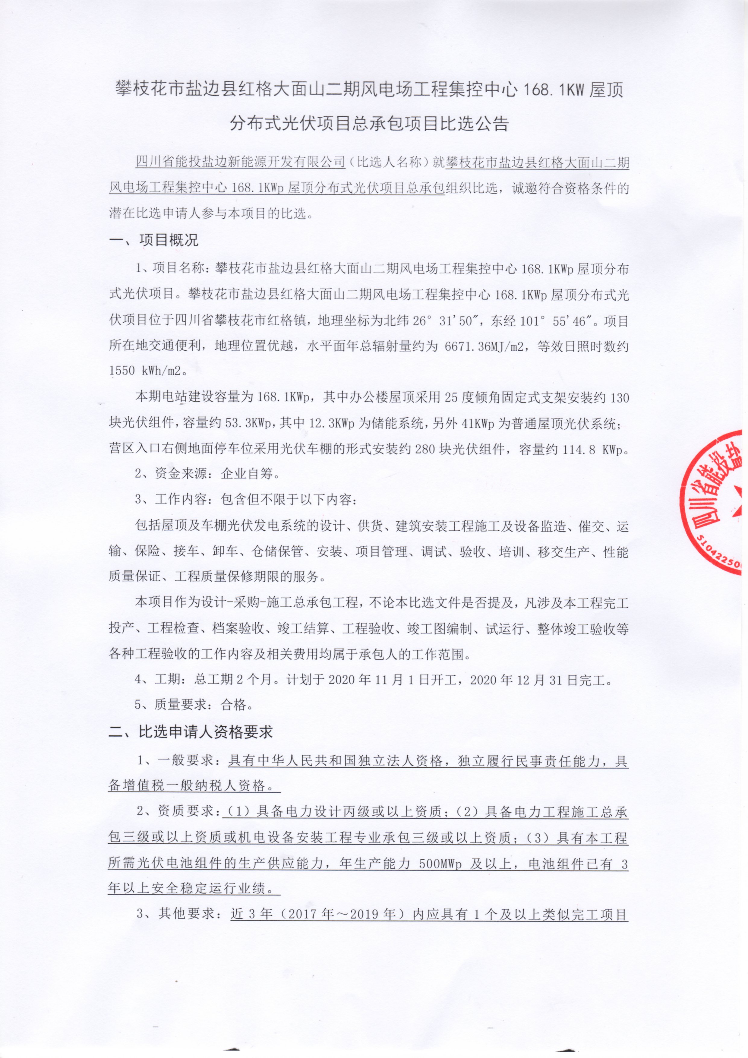 四川省能投盐边新能源开发有限公司(比选人名称)就攀枝花市盐边县红格大面山二期风电场工程集控中心168.1KWp屋顶分布式光伏项目总承包组织比选,诚邀符合资格条件的潜在比选申请人参与本项目的比选。