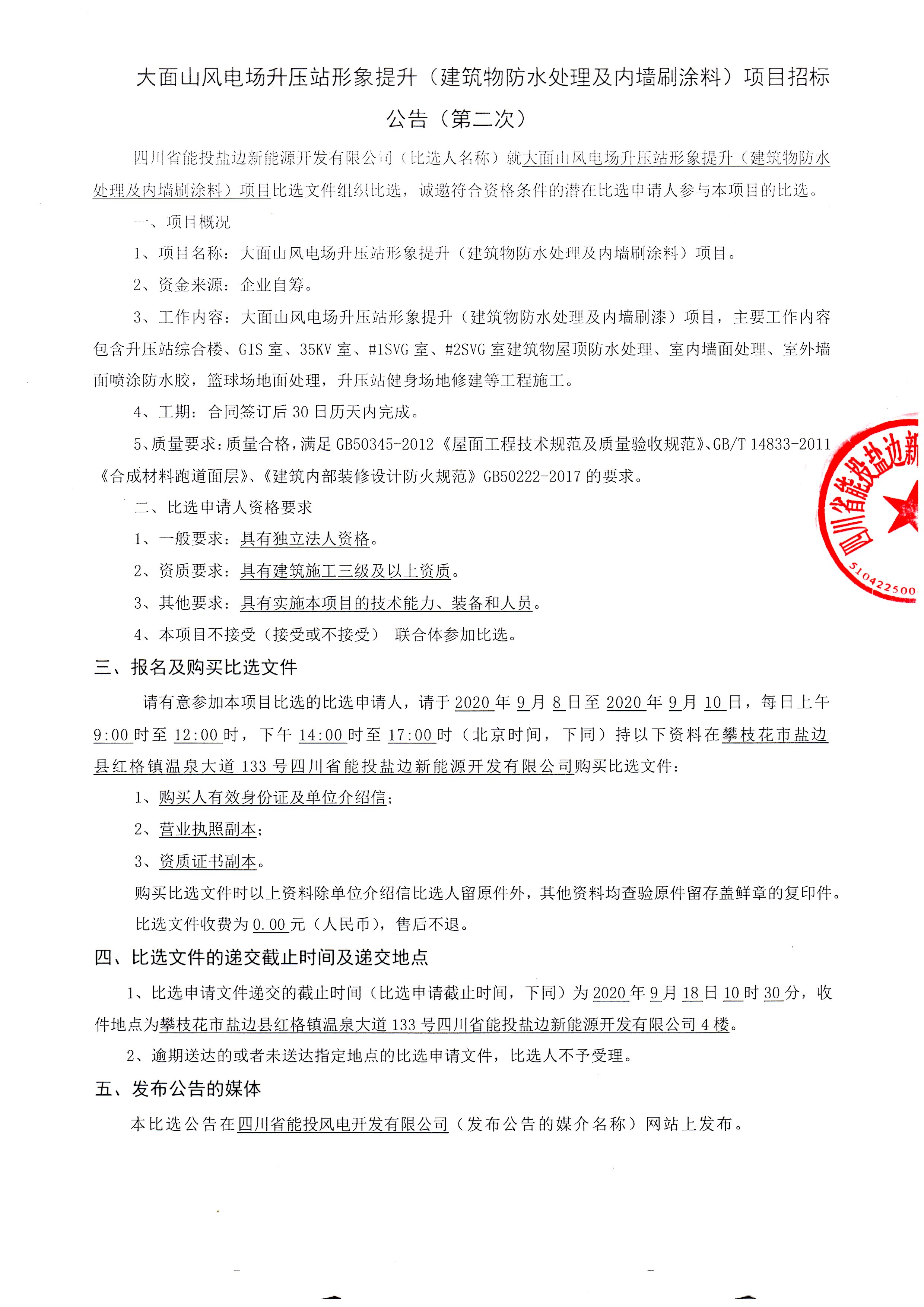 四川省能投盐边新能源开发有限公司(比选人名称)就大面山风电场升压站形象提升(建筑物防水处理及内墙刷涂料)项目比选文件组织比选,诚邀符合资格条件的潜在比选申请人参与本项目的比选。